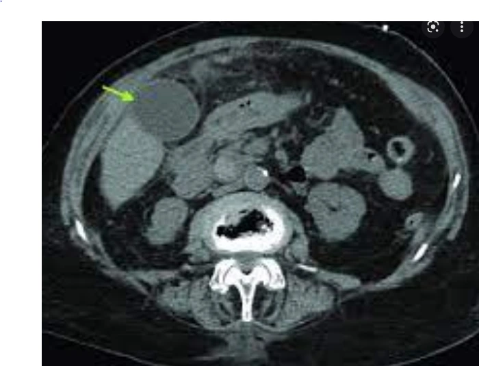초록색 화살표의 동그란 원이 담낭이다. 금식이 되지 않을 시엔 보이지 않는다.