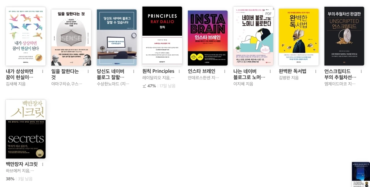 지금은 동시에 여러 권의 책을 읽고 있다. 지금 읽고 있는 책만 해도 4가지이다. 출퇴근길에 읽는 책, 자기 전에 읽는 책, 카페에서 읽는 책, 주말 아침에 읽는 책. 시간과 상황에 따라 읽는 책이 다르다. 하루를 마치는 시간에는 마음공부에 관련된 책을 읽는다. 출퇴근길엔 일터로 가는 길에 걸맞게 경제 관련 책을 읽는다. 카페에서는 조용히 집중할 수 있는 새로운 분야의 책을 시도하고, 주말에는 독서와 글쓰기와 관련된 책을 꺼내든다. 이러다 보면 어느 순간 독서량이 쌓이게 된다. 그리고 다독을 하다 보면 읽는 속도의 향상뿐만 아니라, 어느 순간 책의 핵심을 금방 찾아볼 수 있는 눈이 길러진다.