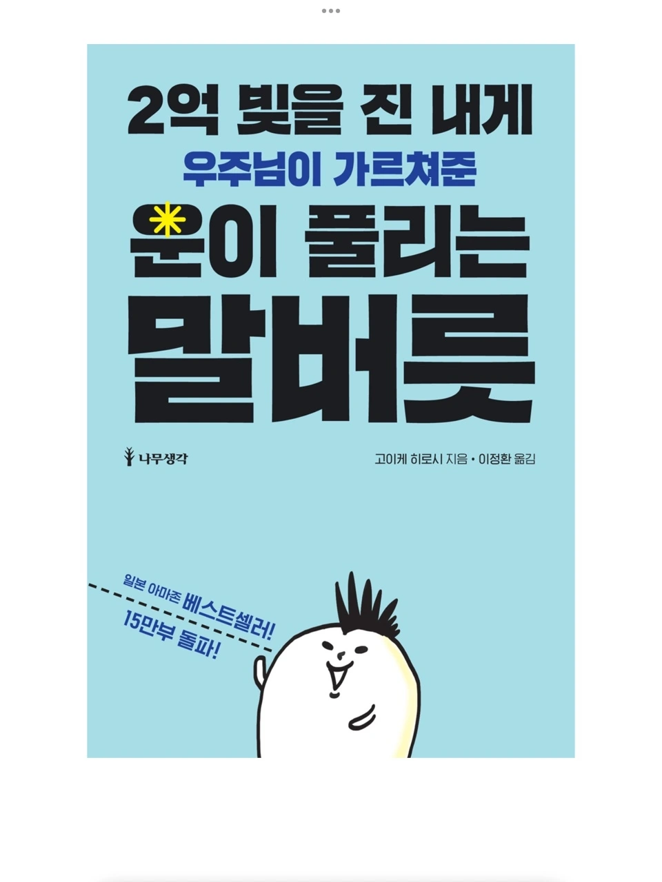 적합한 상황에 적합한 책이란 게 이런 걸까. 최근 부정적 생각과 걱정이 나도 모르게 나를 잠식하곤 했다. 실제로 벌어진 일은 하나도 없었지만 단지 상상 속에서 스스로를 힘들게 했다. 말 그대로 'self-sabotage'의 기간이었다. 이런 상황을 다 알고 있기라도 한 듯, 보고서 양식처럼 '운이 풀리는 말버릇'을 추천해 준 중개사님에게 감사드리며, 북 리뷰 start.