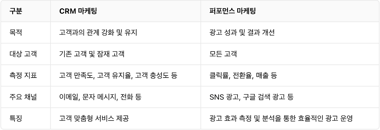안녕하세요! 오늘은 우리가 자주 듣는 마케팅 용어 중에서 퍼포먼스 마케팅과 CRM 마케팅을 비교해보려고 합니다. 저는 6년차 CRM 마케터로서 앞으로 조금 더 전문적인 얘기도 들려드릴 수 있을 것 같습니다. 그럼 함께 들어가볼까요?