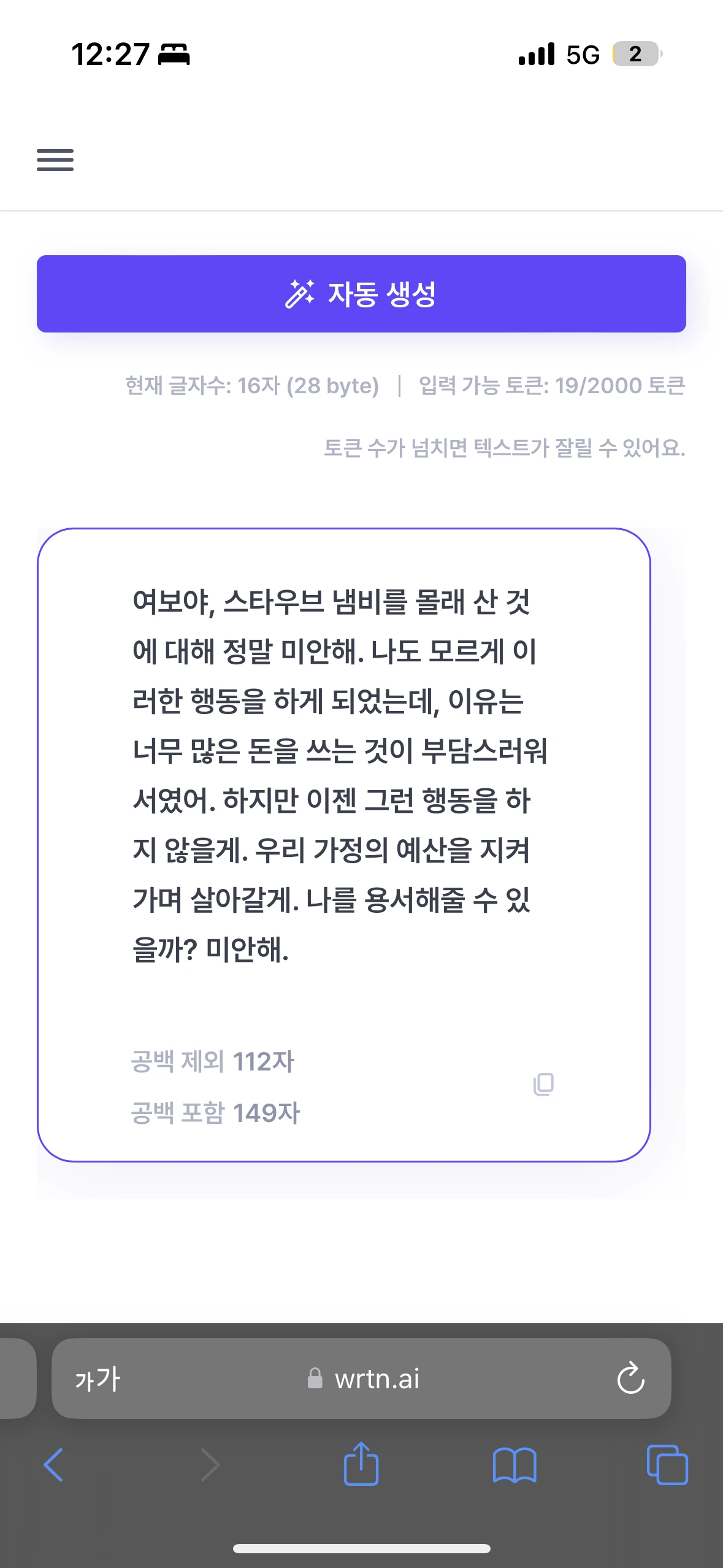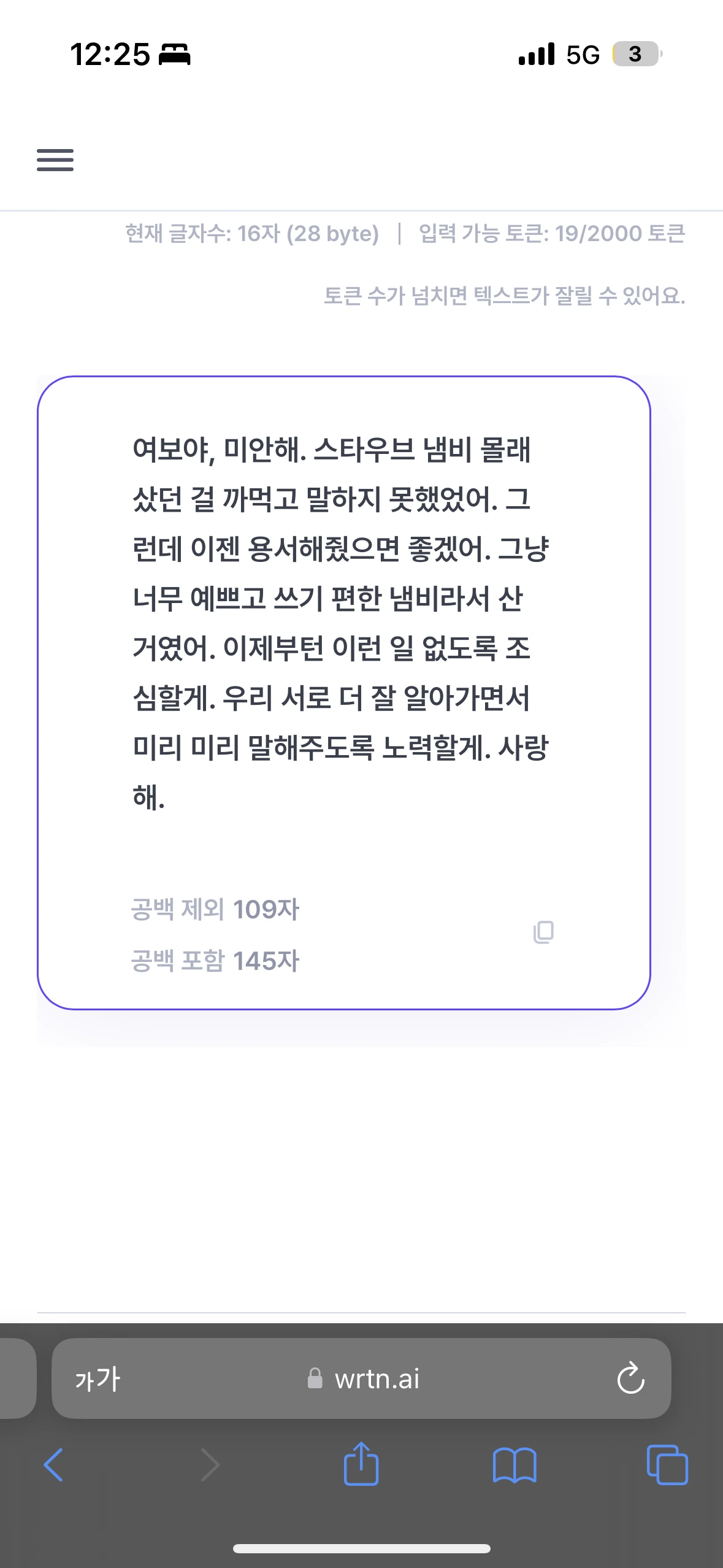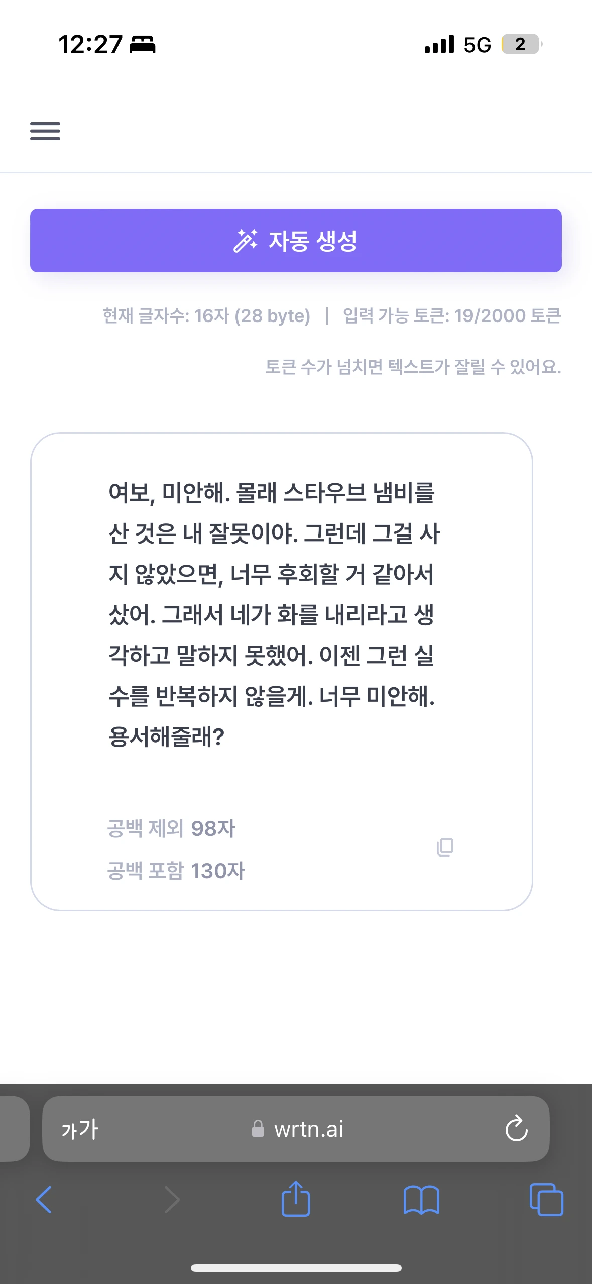 카톡이나 라인, 문자, 비트윈 등에서 사용할 수 있게끔 짧은 글이 나오도록 튜닝하였습니다.