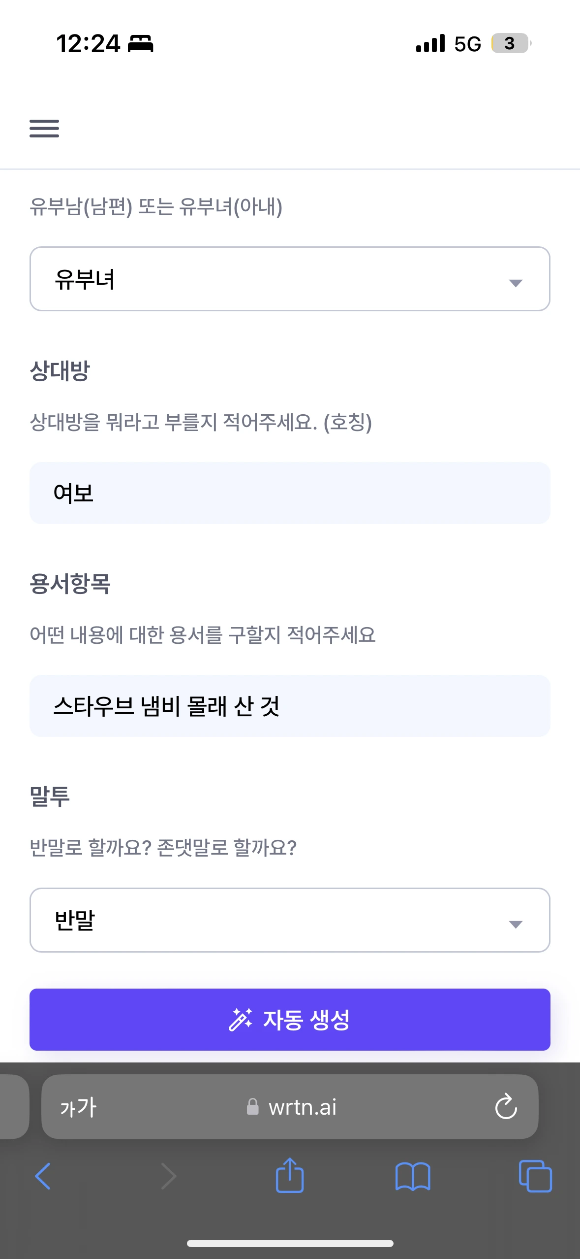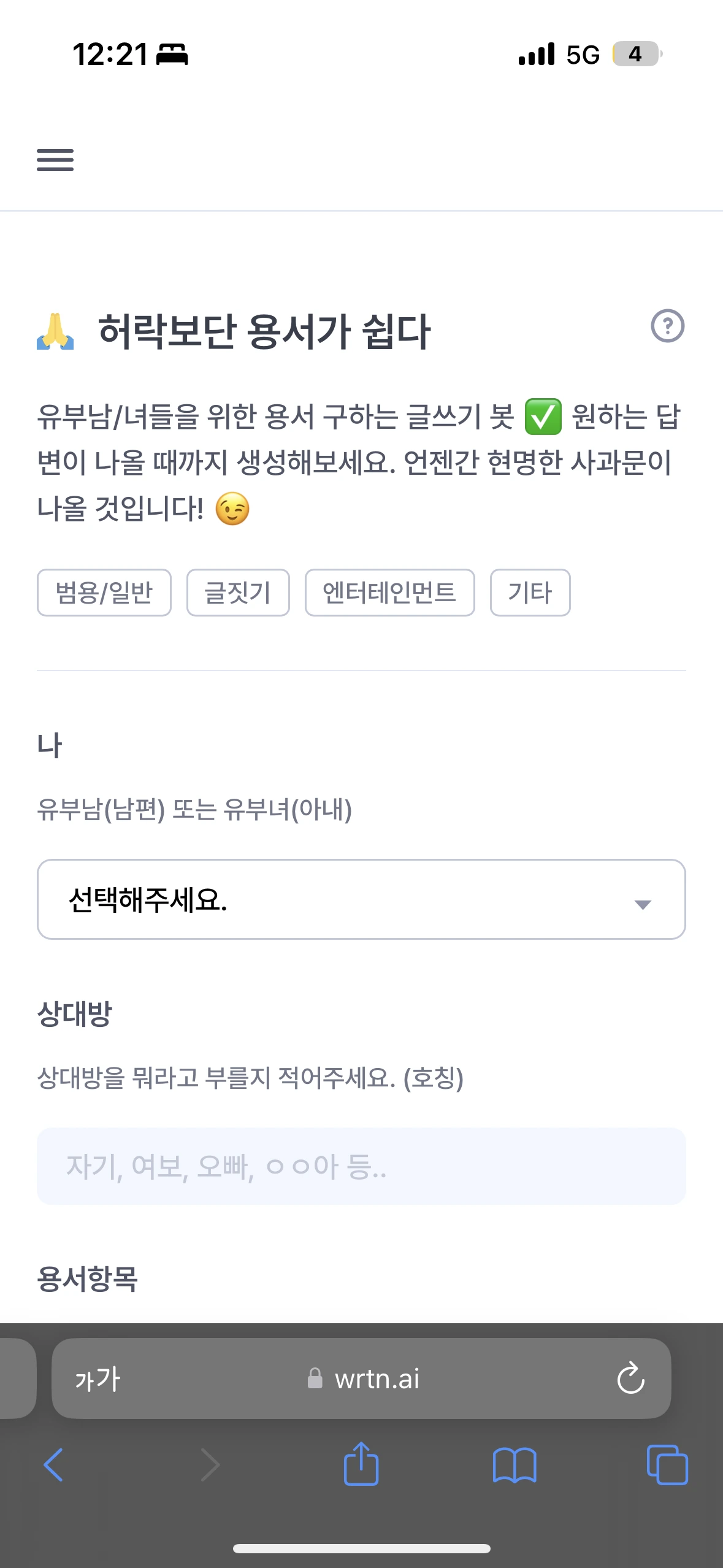나와 상대방, 용서받고 싶은 항목과 평소 말투를 넣으면 사과를 대신해줍니다.