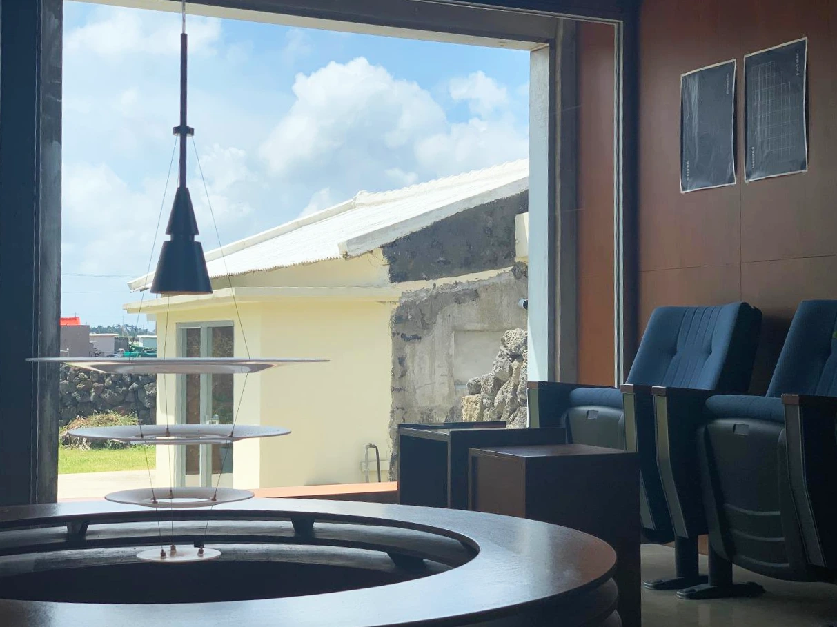 제주 서쪽 작은 바닷가 마을 신창포구에서 좀 더 들어가면 나오는 낡은 농가를 개조한 까페, 돌담을 들어서면 조그마한 잔디마당과 두개의 작은 건물, 고개를 들면 보이는 푸른하늘과 바다가 방문객들을 맞이한다. 그리고 공간을 둘러보다 보면 우리가 알던 까페의 목적과는 조금 다른 무언가를 발견하게 된다.
