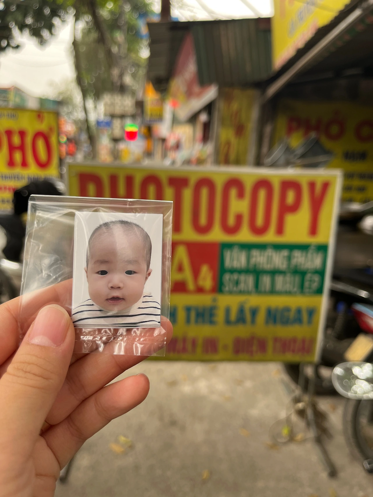 혼자서 호기롭게 도전. 몇십 장 찍고 내일을 기약했다. 이대로는 안 되겠다 싶어서 메이드언니가 저녁 늦게까지 있는 날, 사정을 설명하고 메이드언니가 하빈이를 잡고 내가 찍었다. 30장 정도 찍었을까 괜찮은 사진이 나왔다. 하필 백일사진을 찍고 배냇머리를 밀어버린 하빈이. 여권사진에 시원한 빡빡이의 모습이 담기게 되었다. 그래도 요즘 한국 어플이 잘되어있어서 어플로 사진을 편집하니 그럴듯한 여권사진이 완성되었다. 한국이었으면 바로 인터넷으로 인화를 신청하여 택배로 다음날 받을 수 있겠지만, 여긴 베트남. 살고 있는 아파트에서 멀지 않은 거리에 현지 포토카피샵이 있다는 정보를 얻었다.