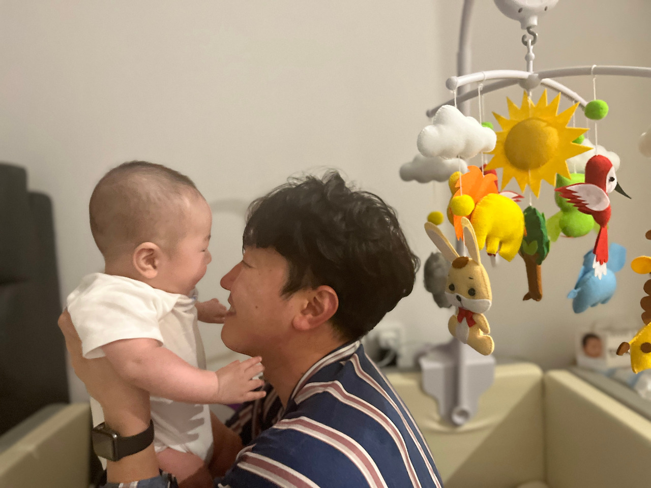 하빈이가 잘 웃는 아기가 된 것에 아빠 지분이 팔 할임은 분명하다. 나는 그런 남편을 보며 똑같이 따라 하거나 모방하며 하빈이에게 웃음을 줬고 하빈이는 눈만 마주치면 방긋방긋 이쁘게 웃는다.