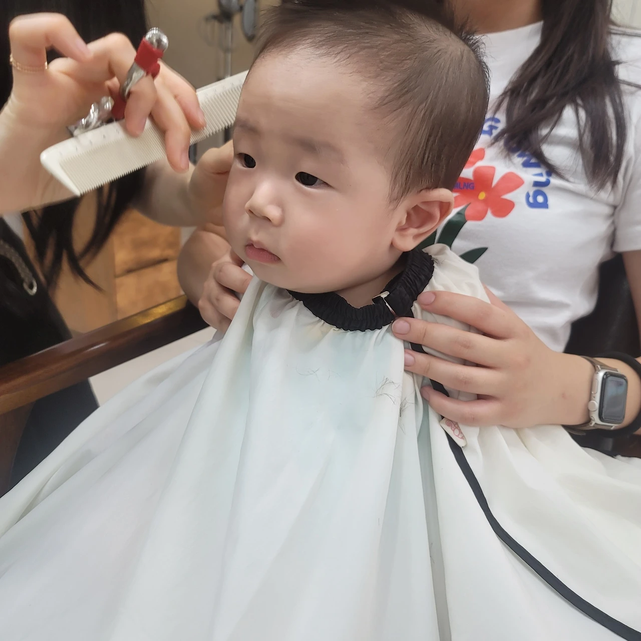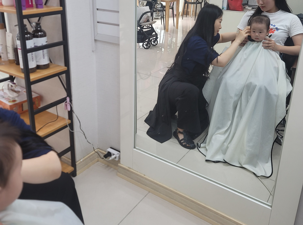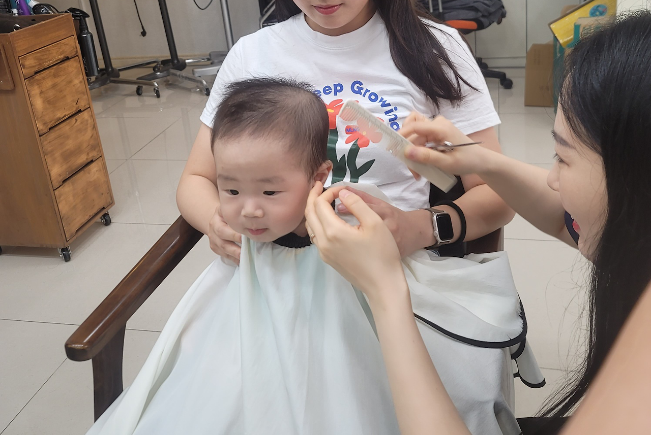 그래서 나는 유모차를 끌고 나갔고, 마침 간 샵에서 커트를 하게 된 하빈이. 사촌동생에게 안겨 의젓하게 커트도 하고 제비초리도 바리캉으로 깔끔하게 정리. 나는 그 모습을 사진도 찍고 동영상에 담았다.