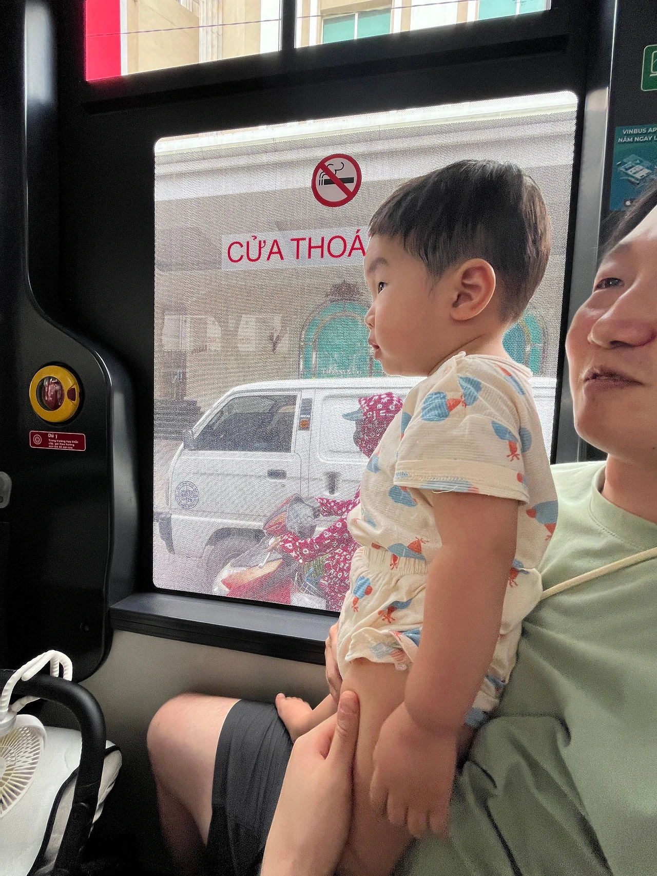 에어컨 빵빵하고 쾌적한 전기버스. 우리는 종점까지 가기로 계획하고 자리를 잡았다. 하빈이는 얼마 안 가 유모차 위에서 잠이 들었고 우리는 도란도란 이야기를 하며 바깥 구경을 했다. 택시 탈때와는 다른 풍경에 우리가 가봤던 곳이 보이면 추억을 꺼내어 보며 하노이 시내 투어를 했다. 하노이 8년 차인 우리도 생활반경은 정해져 있어서 마음먹고 나와야 하는 커다란 서쪽의 호수와 올드타운이 펼쳐진 호안끼엠 호수까지 한 바퀴 쭉 돌았다. 종점에 내려 다시 우리 집이 종점인 버스를 타고 다시 집으로 오는 길. 하빈이가 마침 잠에서 깨서 셋이서 이야기하며 돌아왔다.