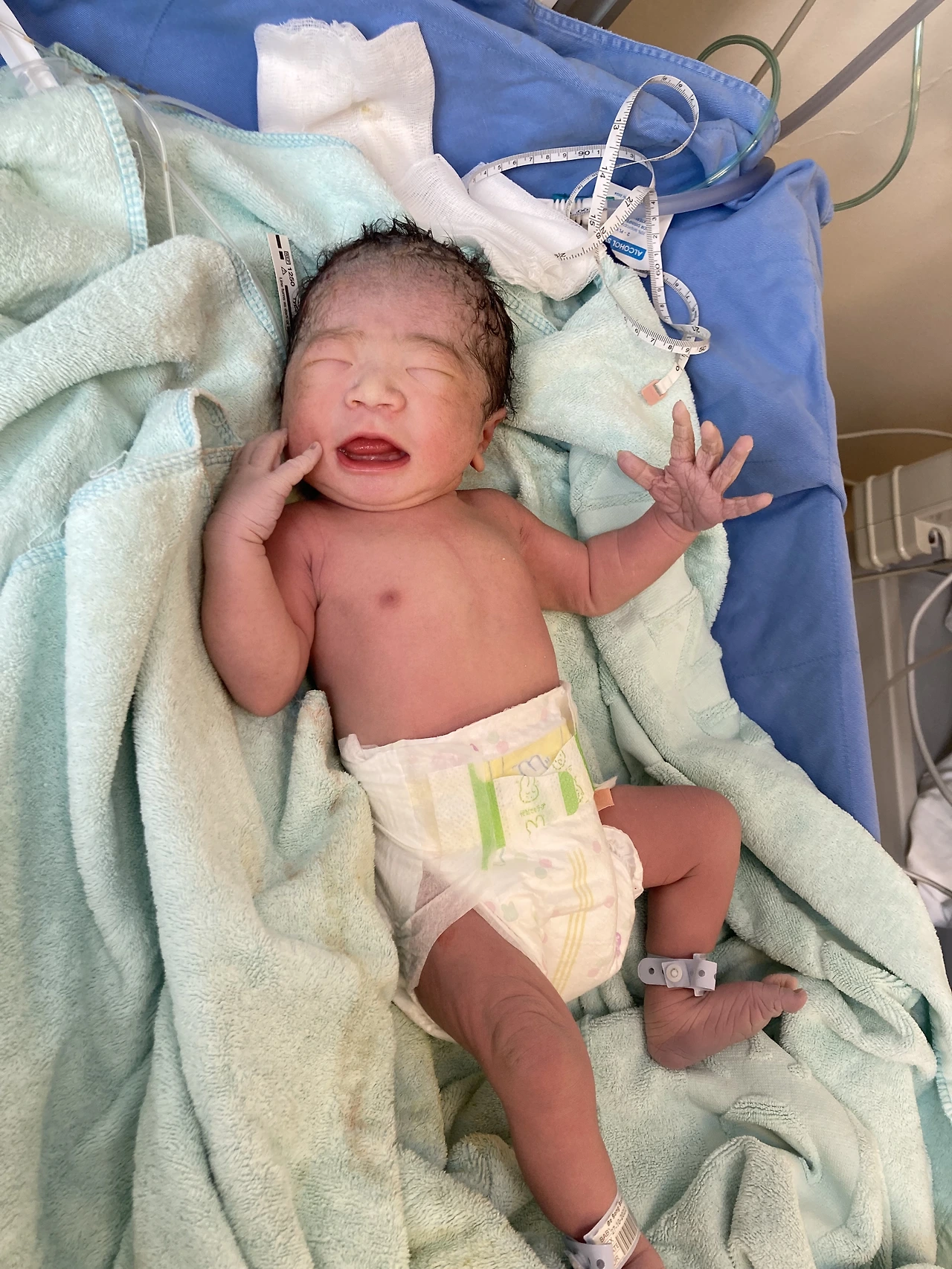 머리가 나왔다고 하고 몸이 쑥~ 나오는데 이렇게 시원할 수가! 딸기가 세상밖으로 나오고 내 가슴 위로 올라오는 순간. 따뜻하고 묵직한 느낌에 눈물이 찔끔 나왔다. 옆에서 사진 찍던 남편이 웃기는 바람에 사진 속 나는 울다가 웃고 있었다.