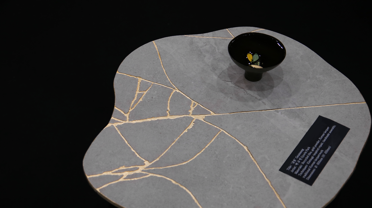 건축 재료에 옻칠과 킨츠기 같은 전통 기법을 접목해 작품을 만들었다.