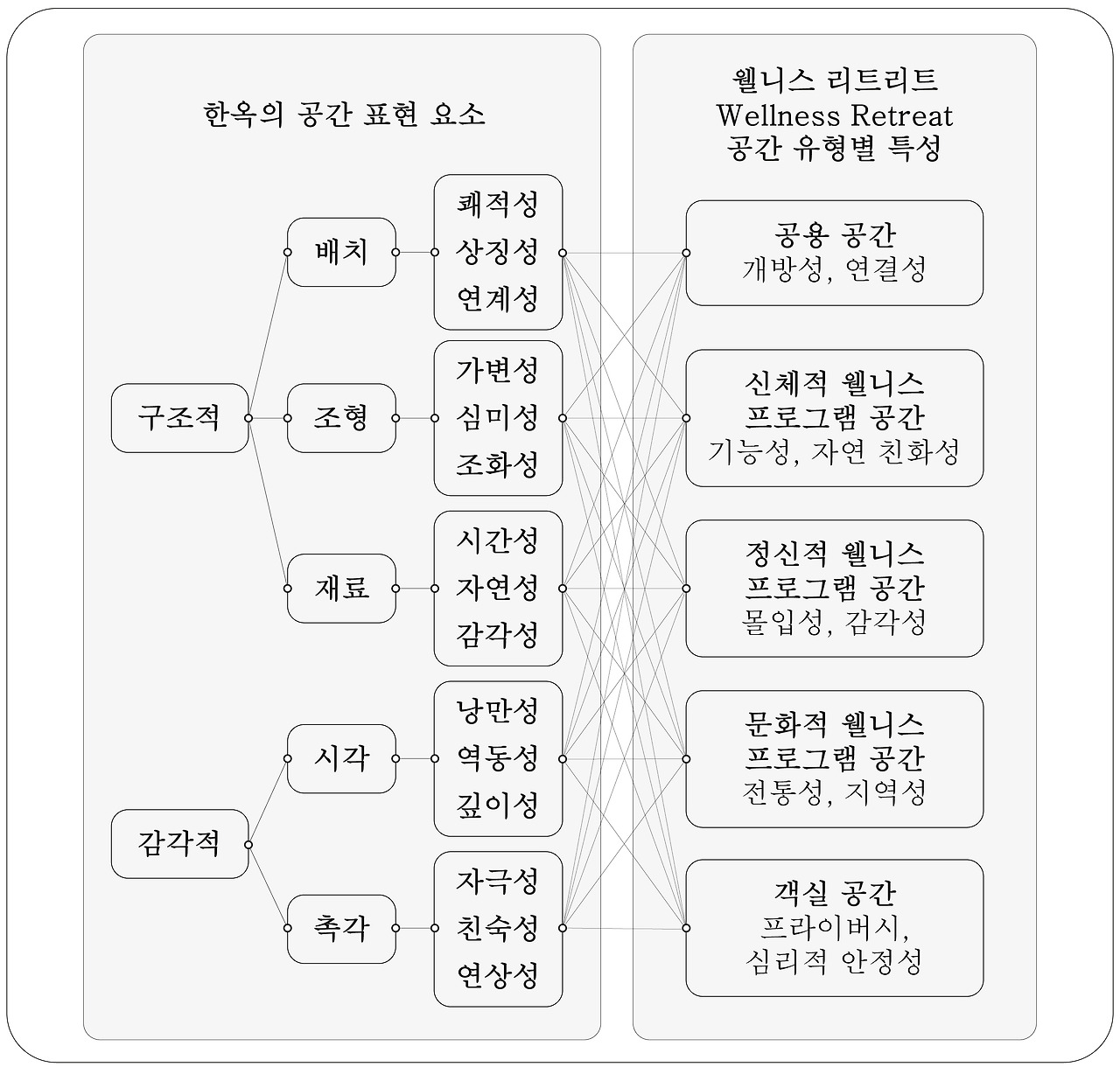 한옥의 공간 특성을 현대 웰니스 리트리트 공간에 통합할 수 있는 가능성을 연구한 적이 있다. 특히 한옥의 구조적·감각적 특성에 주목하여, 이들 요소가 웰니스 프로그램과 공간 만족도에 미치는 영향을 실증적으로 분석하였는데, 이를 바탕으로 한국형 웰니스 공간의 디자인 방향성을 제안하고자 했다.