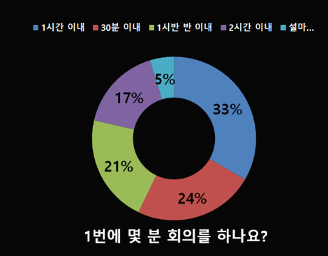 대한민국 직장인들의 50%는 1시간 내로, 80% 가까이는 1시 반 내로 회의를 마무리한다.