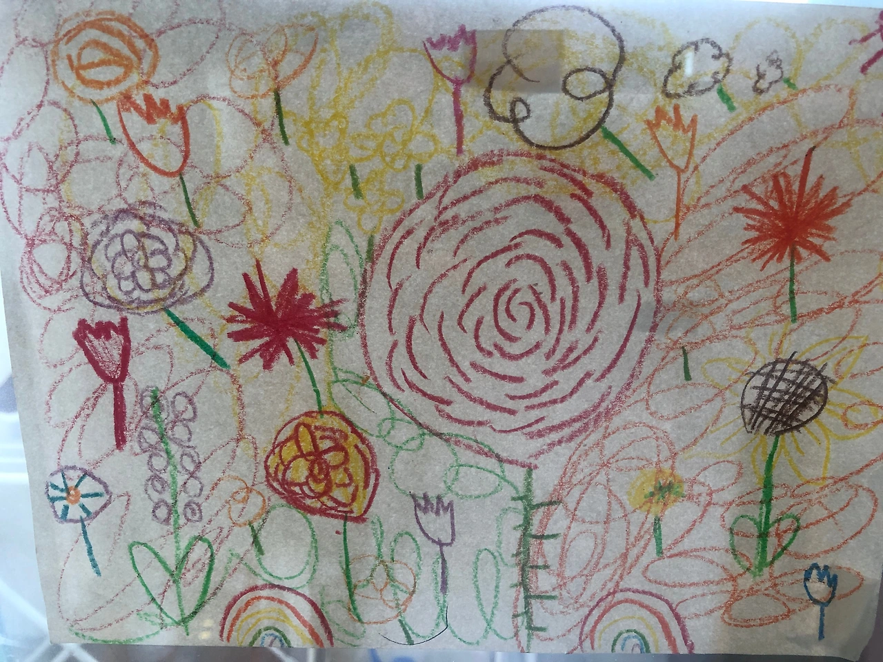 그 작은 손으로 빨강, 노랑, 보라, 주황 여러 색의 크레파스를 꺼내 들고 크게도 그렸다가 작게도 그렸다가 이런저런 꽃들을 정성스레 그려내고 거기에다가 쌍무지개까지 더한다. 이렇게도 공을 들여 그린 그림이라니! 자세히 들여다보면 어느 꽃 하나 똑같은 게 없고 색도 다 다르다. 아이의 그림에는 대충이 없다. 하나하나 마음이 담겨있다.