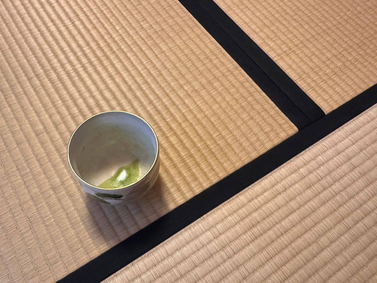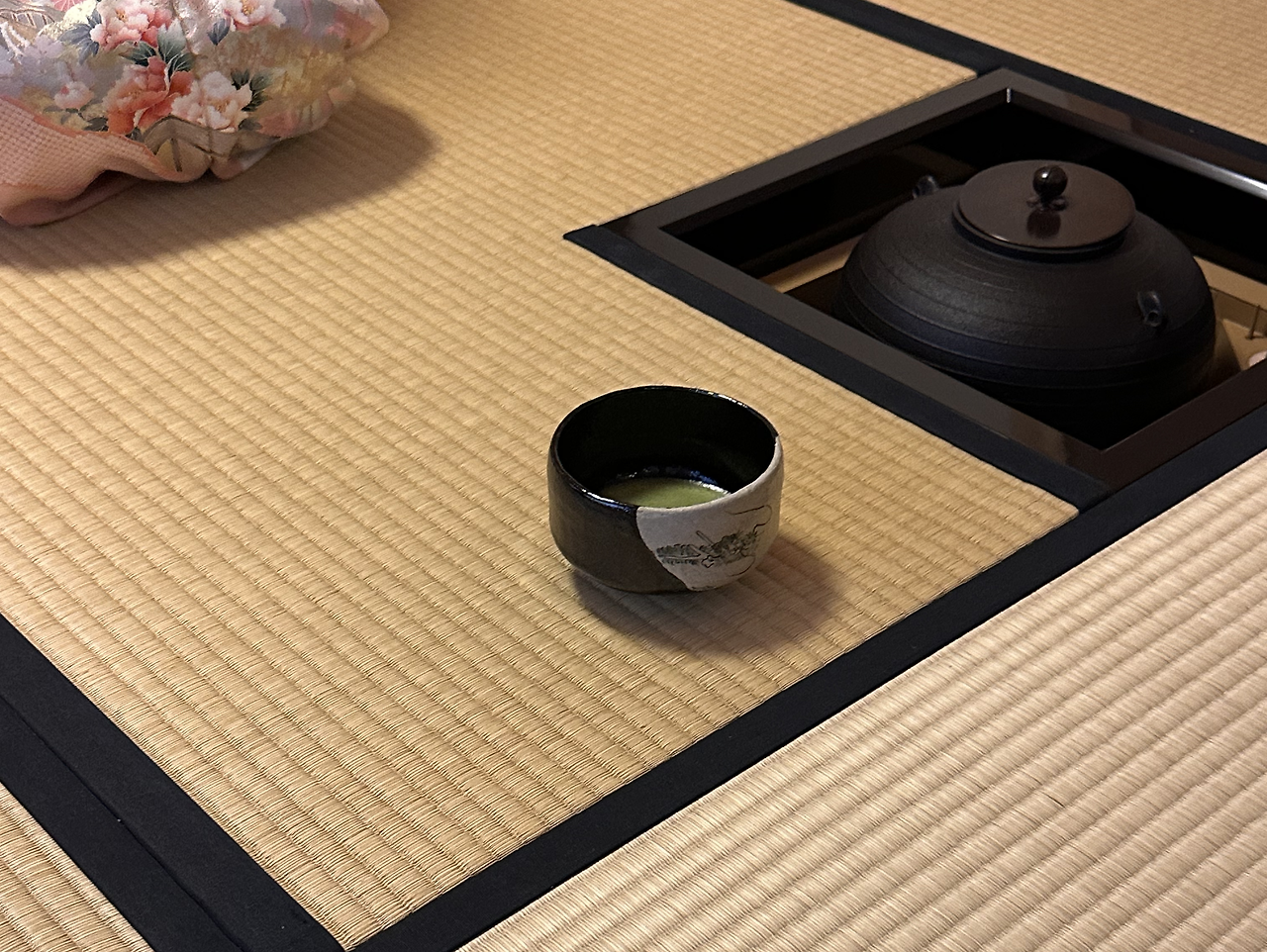 앉은자리 기준 다다미 선 바깥은 타인의 영역이고 안쪽은 내 영역이다. 선 바깥에 놓여 있는 다완(찻잔)을 오른손을 뻗어 내 앞으로 들여와 왼손 위에 올려놓고 오른손으로 잔을 한번, 두 번 시계반향으로 돌린다. 잔에 그려진 멋진 그림, 문양 등을 감상하며 또 그 부분을 비껴 마실 부분을 찾는 과정이다.