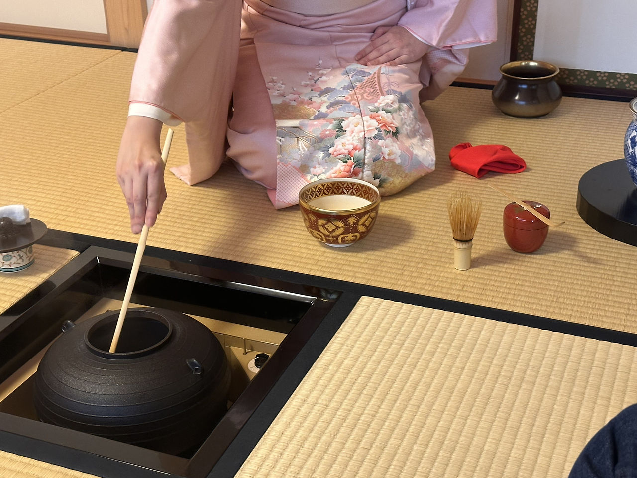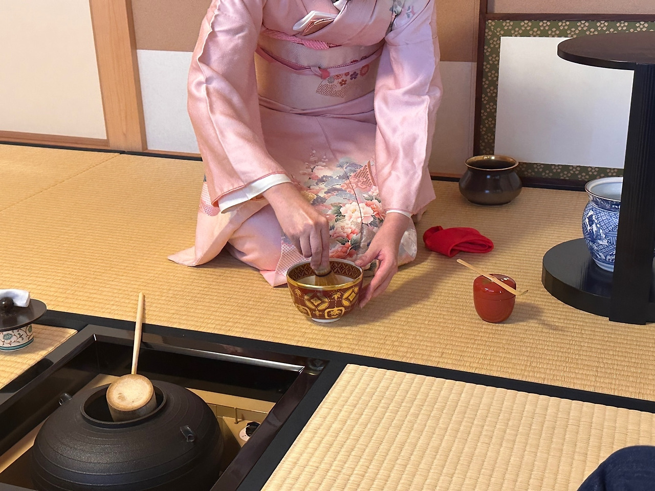 우리보다 앞서 시작된 다회를 감상하기 위해 대기석에 앉았다. 기모노를 입은 베트남인, 엄마 옆에서 정자세를 하고 있는 일본인 소녀가 첫눈에 띄었다. 잠시동안 고요히 바라보고 있다가 남편이 긴장 섞인 우려의 소리를 전한다.