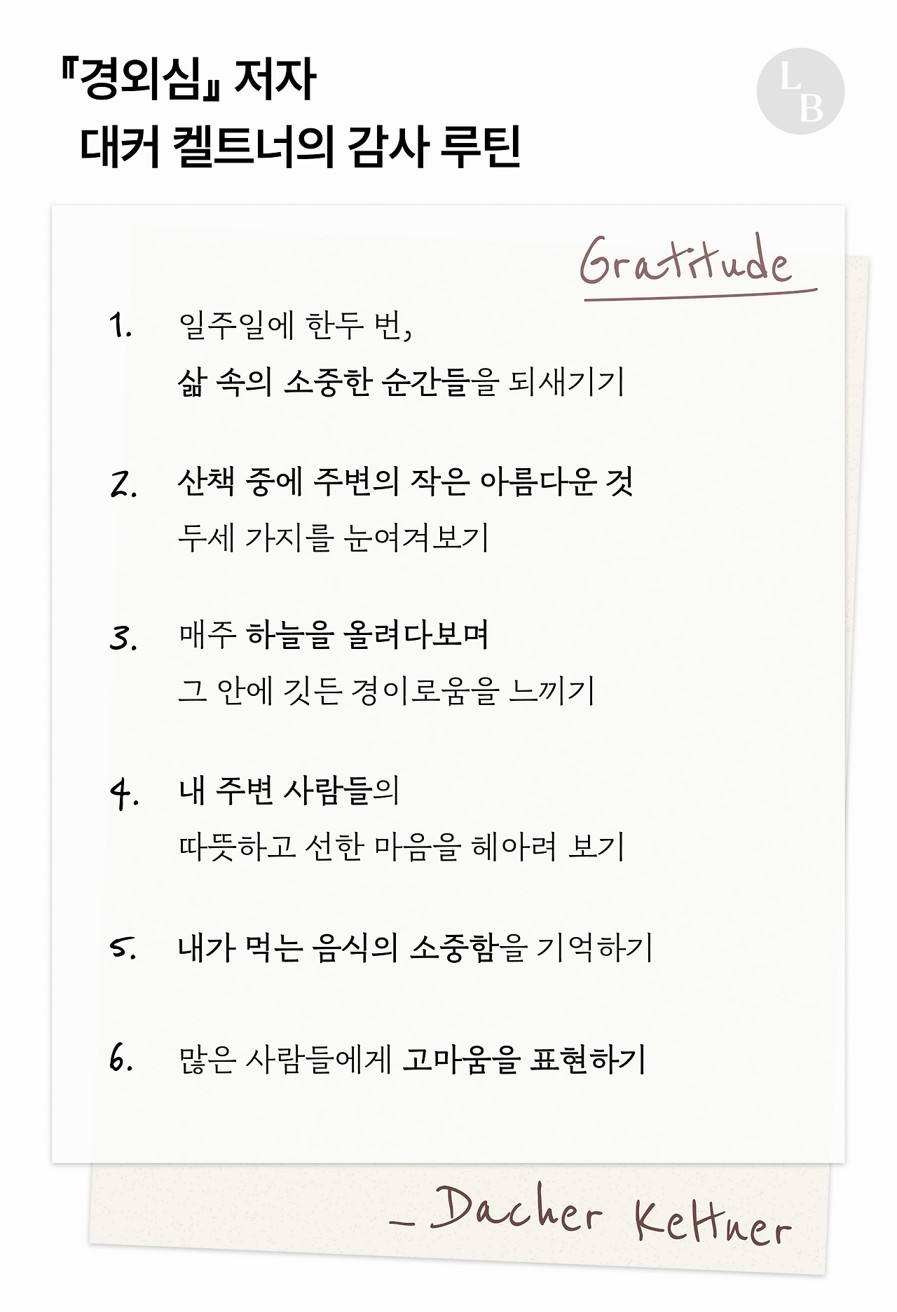 감사일기 쓰기, 산책 중 주변의 아름다운 것 두세 가지 눈여겨보기. 주변인들의 따뜻하고 선한 마음 헤아려보기. 가지 않던 장소 가보기 등 실천해 볼 수 있는 것들을 솎아내 본다.