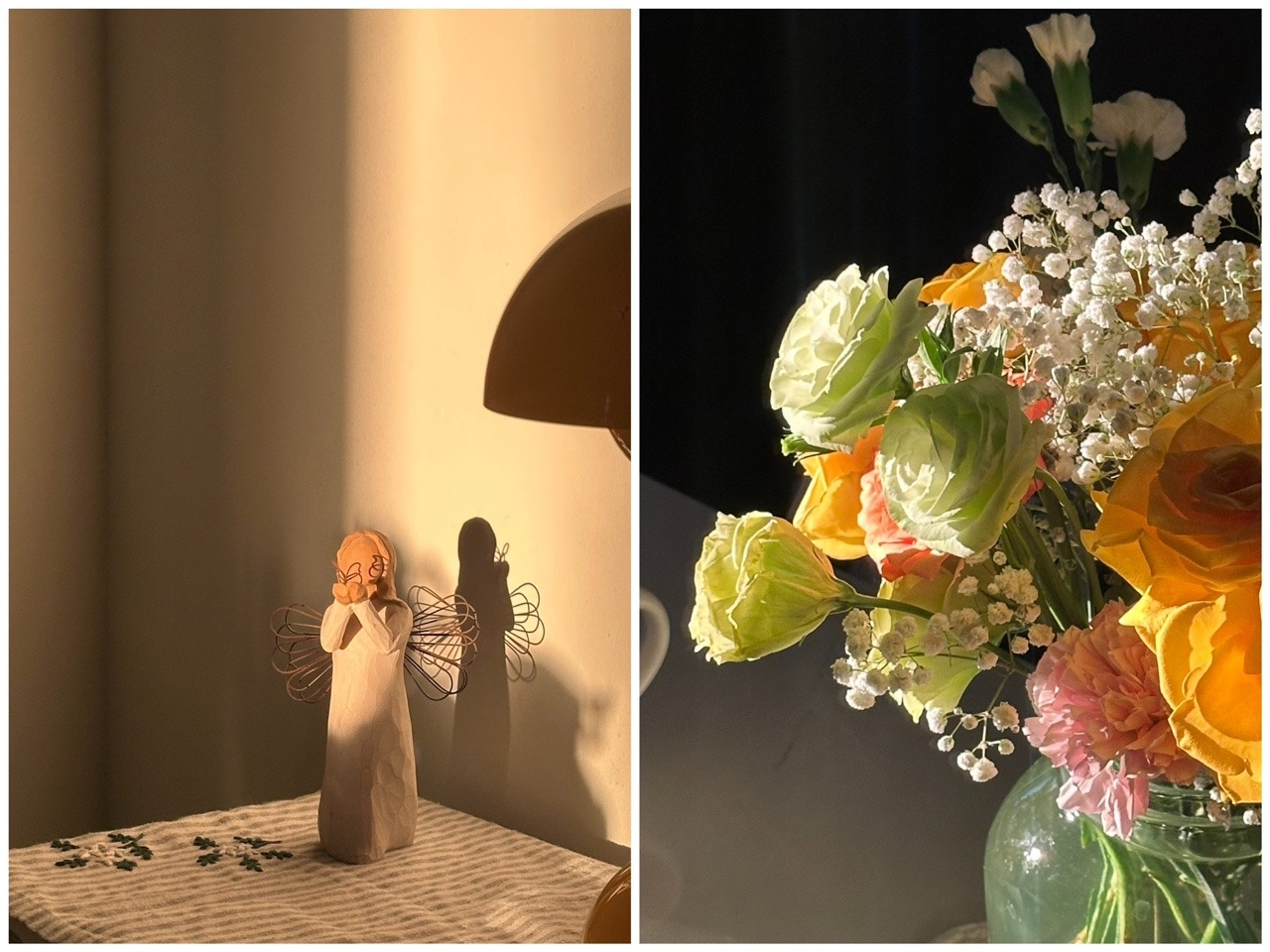원래 해가 잘 안 드는 거실인데 바깥 건물 사이, 우리 집 방구조, 가구 틈을 비집고 이렇게 잠깐동안 빛이 들었더랬다. 한 5분 남짓 했으려나. 나흘 전 첫 공연 때 내가 딸아이에게 줬던 그 꽃과, 6년 전 여행 중 오래도록 머문 크리스마스 상점에서 고심하여 골라온 천사 목각 인형 위를 나란히 비추고 있었다. 당시 이 천사를 이리저리 매만지며 '유용한' 기능 없는 이 장식품을 이 만한 비용을 들여 캐리어에 싣는 게 맞나? '그래도 사고 싶은데... 아니 이거 내 거 맞는데...' 라며 들었다 놨다 했던 때를 기억한다. 누구도 뭐라 하지 않았던 그 순간이건만, 오늘에야 불러와 그때의 나에게 '이것 봐 잘 데려왔지!'라고 늦게나마 잠깐 우겨보며 기뻤다. 뭔가 염원하던 내 기도를 하늘로 바로 쏘아 올려줄 듯한 벅찬 마음까지 들고 말이야.