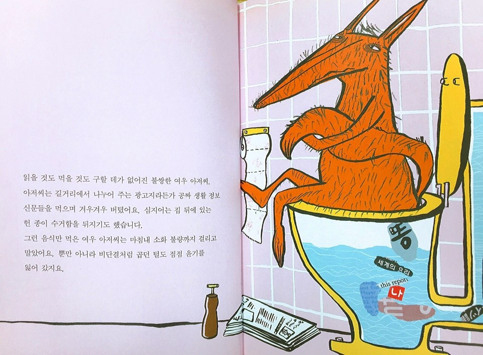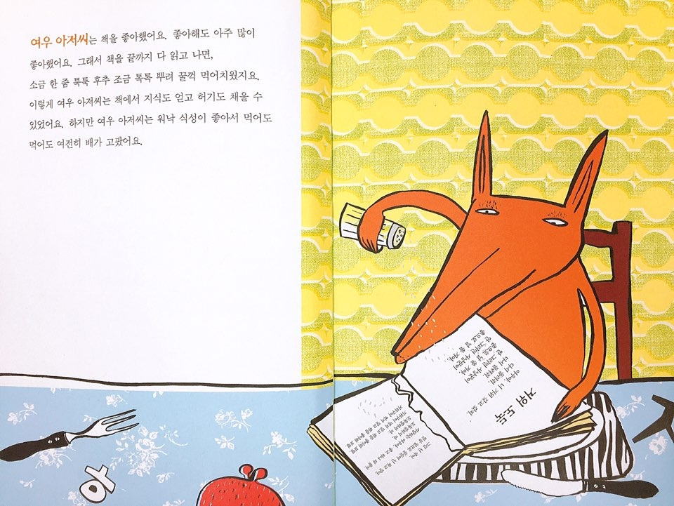 "여우 아저씨는 책을 좋아했어요. 좋아해도 아주 많이 좋아했어요. 그래서 책을 끝까지 다 읽고 나면, 소금 한 줌 툭툭 후추 조금 톡톡 뿌려 꿀꺽 먹어치웠지요."