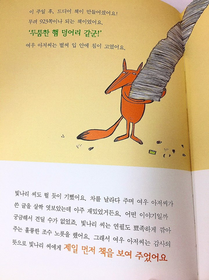 독일 동화 <책 먹는 여우>의 주인공 여우씨는 우리네 정서로 보자면 '권선징악'에 반대되는 유형이다. 책이 맛있어서 먹어치우다가 결국 서점에서 강도짓을 한 혐의로 구속된다. 그리고 감옥에서 자신이 '먹기 위한' 소설을 만들고 그 책은 우연찮게 출간되어 명성과 부를 거머쥔다.