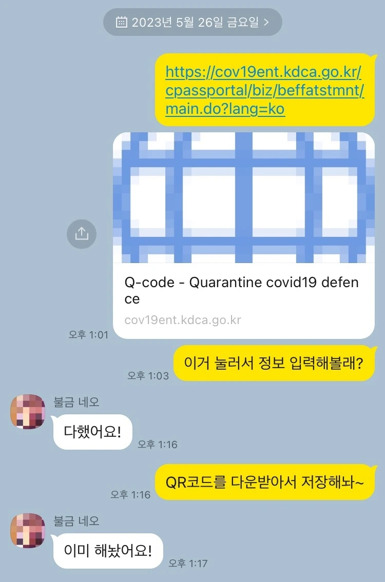 여행을 준비하며 여러 번 서류를 작성해 본 아이들에게 Q코드는 그리 어렵지 않은 절차였다. 링크를 보내주자 입력부터 다운로드까지 착착 해냈다.