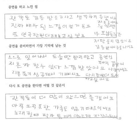 나는 아이들의 아픔에 공감하지만 그 크기를 감히 알지 못한다. 이 연극이 아이들에게 치유의 과정이 되리라 믿지만 무대에서 자신의 상처를 드러내는 것이 얼마나 힘겨울지 그 깊이를 짐작할 수 없다. 어쩌면 예상보다 더 많은 시간을 필요로 할지도 모르는 일이었다.