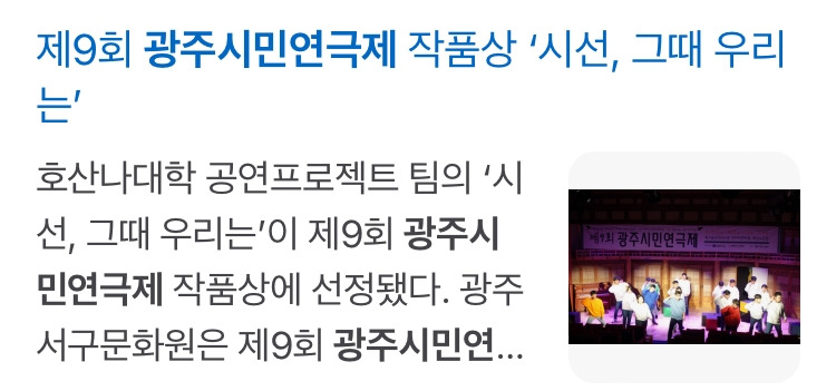 청평에서 광주까지 먼 길을 고생한 보람이 좋은 성과로 나타난 것도 기뻤지만 무엇보다 우리 아이들의 이야기가 우리만의 이야기로 그치지 않고, 다른 사람들에게 공감을 받았다는 것이 기뻤다. <시선, 그때 우리는>은 아이들의 실제 경험담을 바탕으로, 아이들이 직접 대사도 쓰고 함께 만든 작품이기에 무대에 올리는 것만으로도 우리에겐 충분히 의미 있는 일이었다. 그런데 그 이상으로 값진 성과를 얻었으니 참 감사한 일이다.