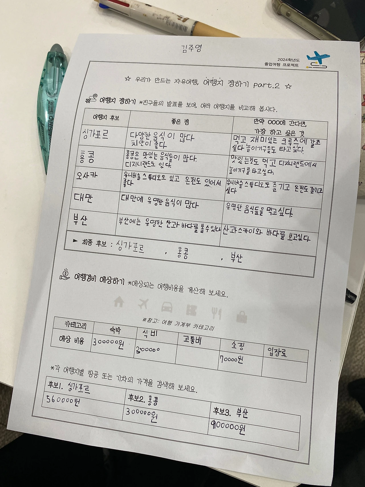 학생들의 조사 및 발표, 항공권 가격 조회와 대략적인 비용 계산의 과정까지 거친 후 후보지는 부산, 홍콩, 싱가포르 셋으로 좁혀졌다. 그리고 최종적으로 부모님들 수요조사를 통해 올해의 졸업여행지는 홍콩으로 결정되었다. 지난해처럼 오사카를 선택하지 않을까 싶었는데 의외의 결과였다.