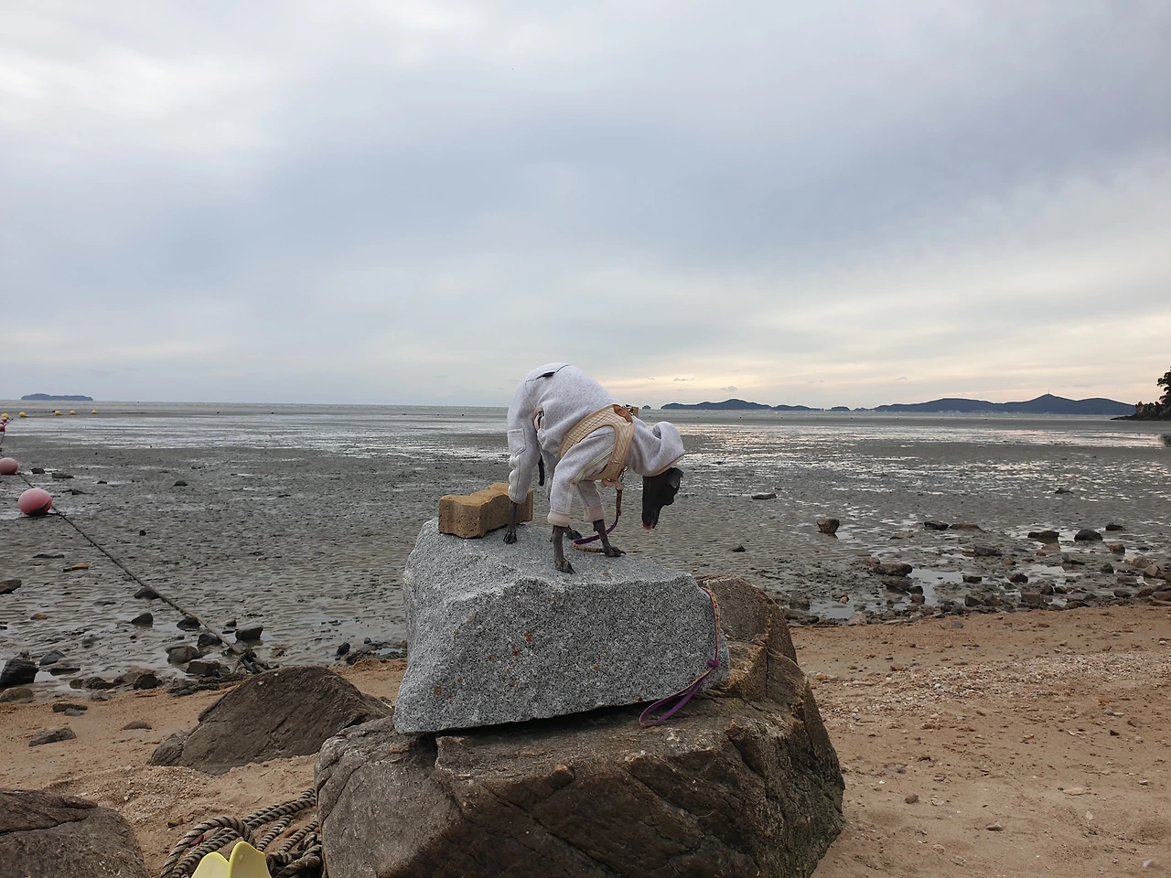 예전에 인천에서 출발할 때는 가깝다고 느꼈던 석모도가 일산에서 출발할 땐 생각보다 멀었다. 한두 시간 걸렸던 것 같다. 에너지를 충전하기 위해 까르를 안고 차 뒷자리에 누워 실려가듯 펜션에 도착했다. 석모도는 참으로 시골이었다. 짐을 풀고 펜션 근처의 닭과 염소에 관심을 보이는 까르를 데리고 산책을 나갔다. 외포항과 민머루 해수욕장을 둘러봤는데 우리 까르는 난생처음 밟아보는 바다 모래에 깜짝 놀라서 잔뜩 기가 죽어 벌벌 떨기만 했다. 그렇지만 오랜만에 바닷바람을 맞으며 캠핑족들의 활기찬 모습을 보니 집 떠나 나왔구나 실감이 났다. 남동생 부부가 오기 전까지 컨디션이 좀 나아져야 할 것이라서 얼른 돌아와 짐을 풀고 냉장고 정리도 하고 바쁘게 몸을 움직였다.