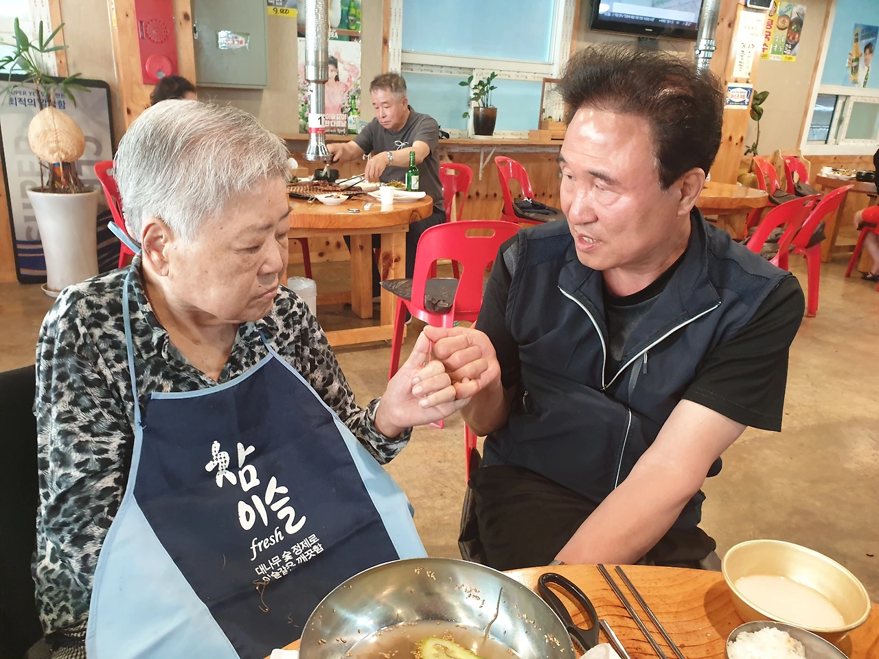우리는 멀리 가기는 어려워 요양원 옆 건물의 식당에 갔다. 아빠는 익숙하게 할머니 몫으로 냉면을 주문했다. 급식으로 하루 세끼를 먹는 할머니는 아들이 평소 좋아하던 음식을 주문해주자 표정이 밝아졌다. 한 번도 나를 보면서 그런 밝은 표정을 지은 적은 없었지만 아빠에 대한 할머니의 사랑은 늘 얼굴에서 읽을 수 있었는데 세월이 흘렀어도 그 모습은 그대로였다. 안타깝게도 할머니는 혼자서 젓가락질을 할 수없었다. 아빠는 식사를 제쳐두고 본격적으로 할머니에게 붙어 보조 하기 시작했다.