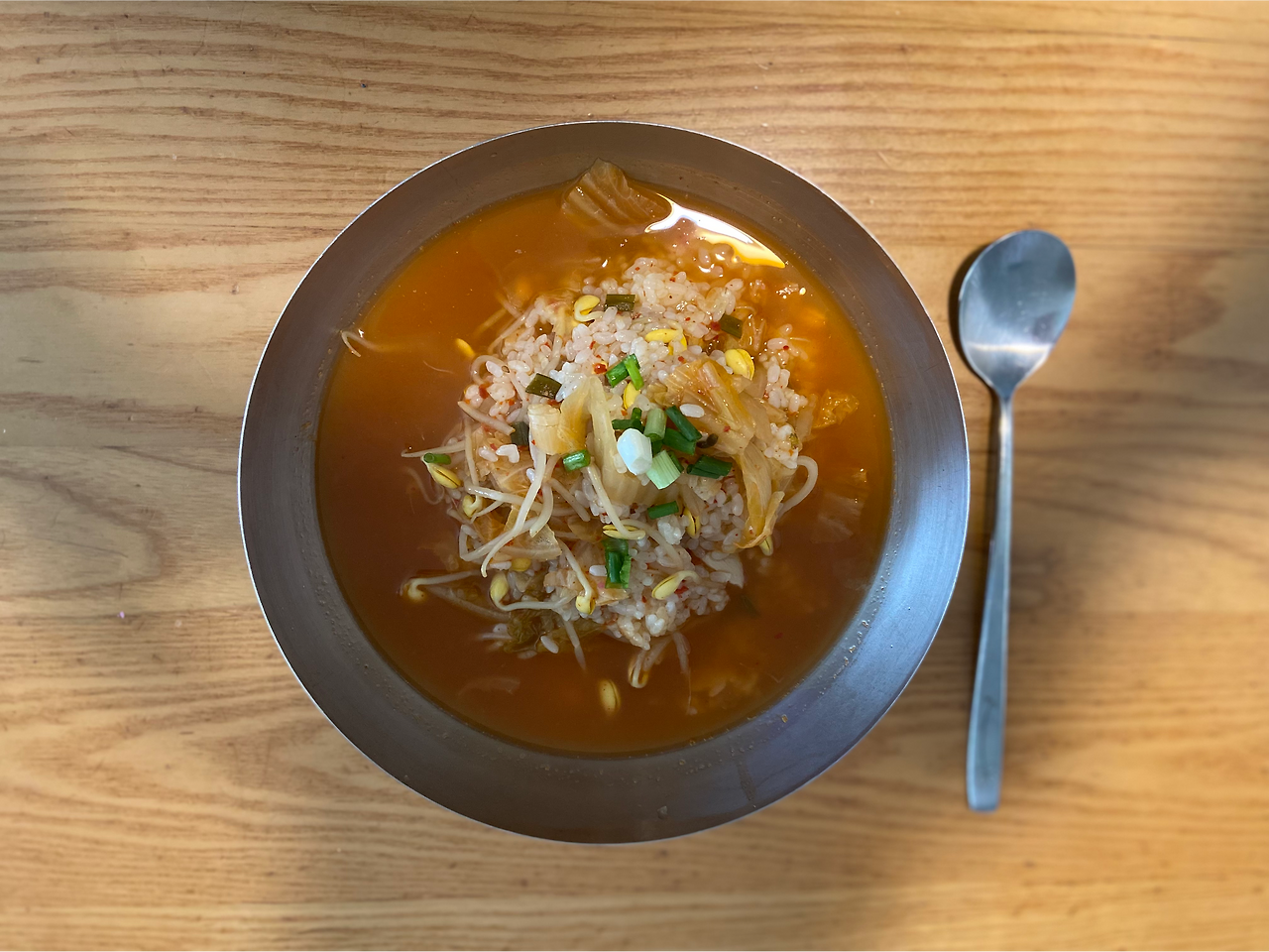 다시마 육수에 김치와 콩나물을 넣고 보글보글 끓이다가 소금, 참치액젓으로만 간을 하고 파를 조금 넣고 밥을 넣어 한번 더 끓이면 완성! 밥은 너무 오래 끓이면 죽처럼 퍼지기에 나중에 넣어야 한다.