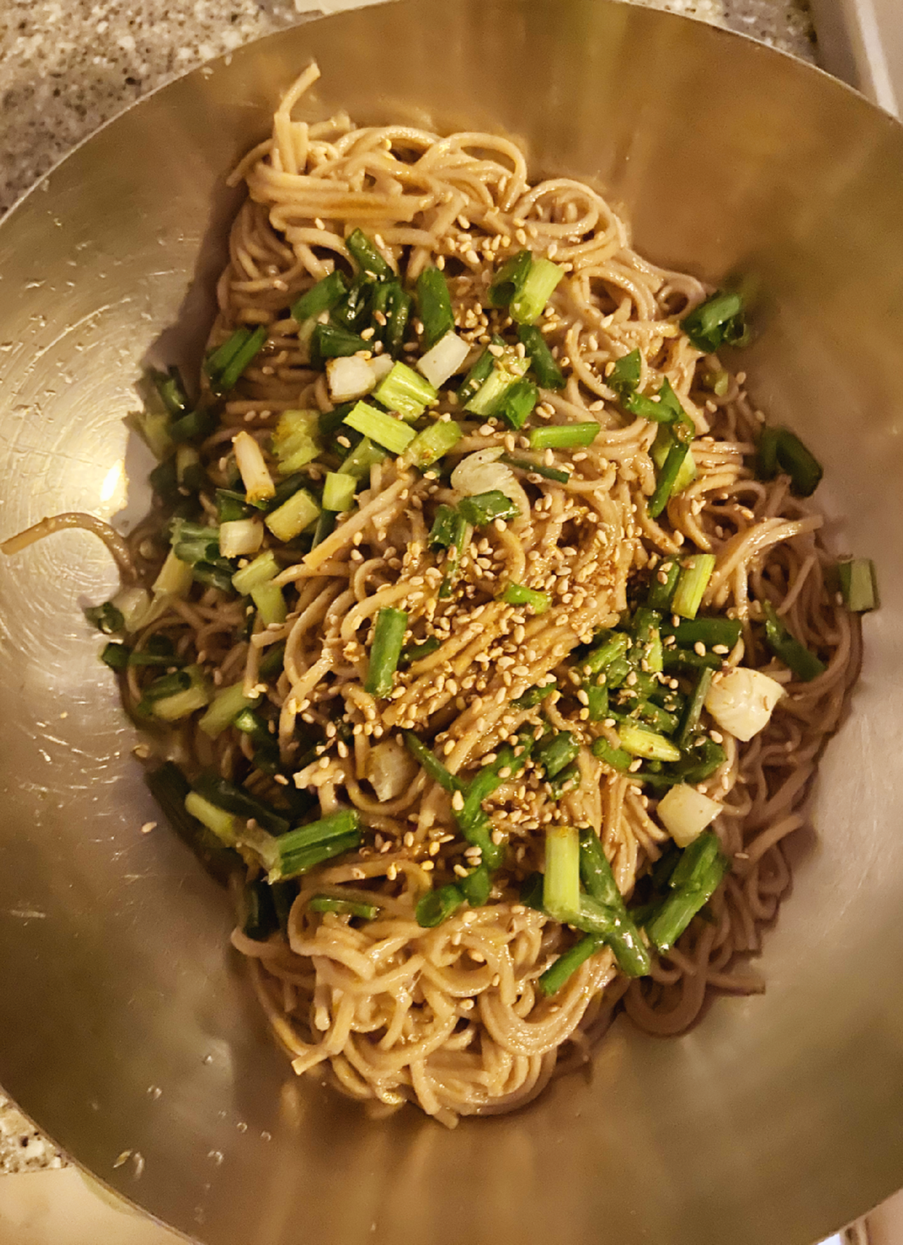 메밀국수를 삶아 찬 물에 헹구고 그릇에 넣어 들기름, 진간장을 '적당히‘ 넣어서 비벼 놓고 그 위에 파와 김가루만 얹어 먹으면...? 생각보다 맛있다! 여기에 참치액을 조금만 더 넣으면 음식점에서 먹는 그 감칠맛도 난다.