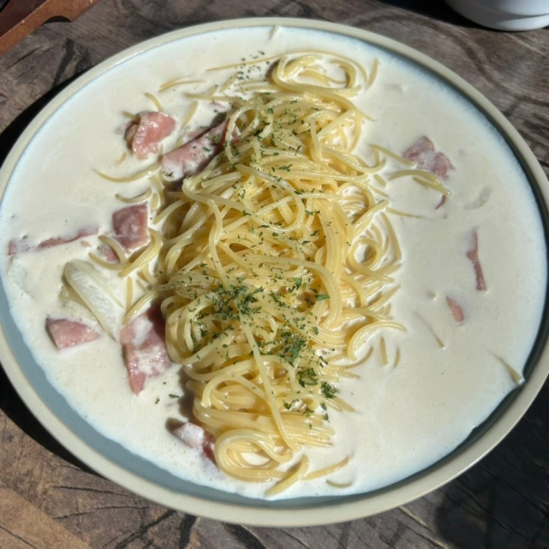 버섯, 햄, 마늘을 총총 썰어 넣어 올리브유에 볶다가 우유, 치즈를 넣고 살살 저어주고 그 사이 7-8분 끓인 물에 삶았던 면을 넣어 휙휙 저어주면 크림파스타 완성! 여기에 기호에 따라 소금을 한두 꼬집 더한다. 간단하고 참 고소하다.