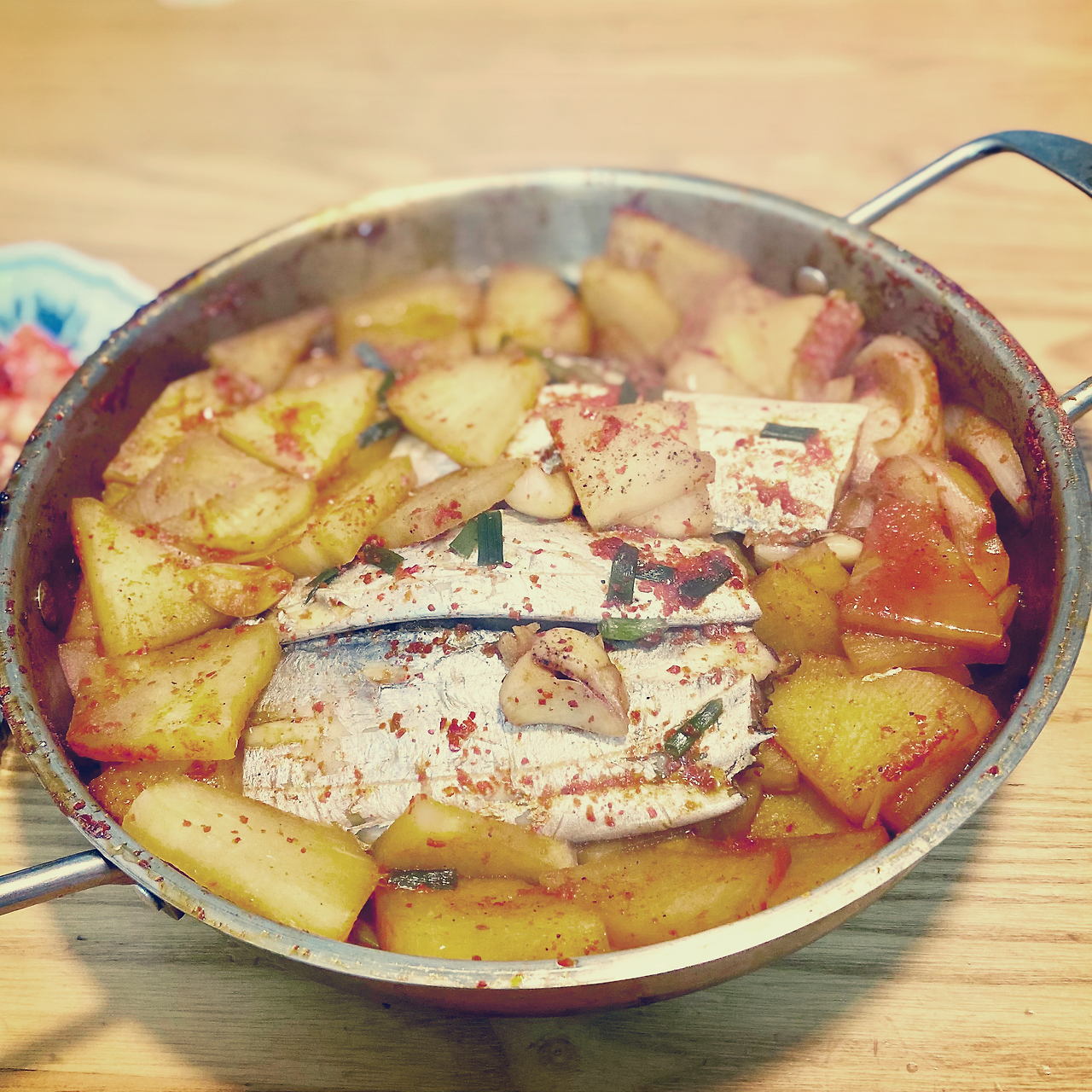 냄비에 멸치 육수를 좀 넣고 무우을 깔고 그위에 갈치와 양념장을 더해 보글 보글 끓이니 어느새 밥도둑 갈치조림 완성 !