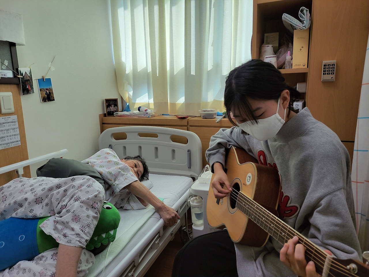 쉼 없는 노동으로 닳고 달아 없어진 지문과 갈라진 손끝, 비쩍 말라버린 거친 손으로 손주들의 얼굴과 손을 한없이 쓰다듬었고, 앙상한 그 손으로 꽁꽁 언 아이들의 손을 정성스레 녹여주었다. 엄마는 본인의 아픈 몸 보다, 아이들의 언 손이 더 마음이 쓰이고 속상했던 것이다. 엄마와 벽에 걸린 사진들을 보며 같이 웃고, 이야기를 나눴다. 때로는 누워서 손주들이 준비한 공연을 보기도 했다.