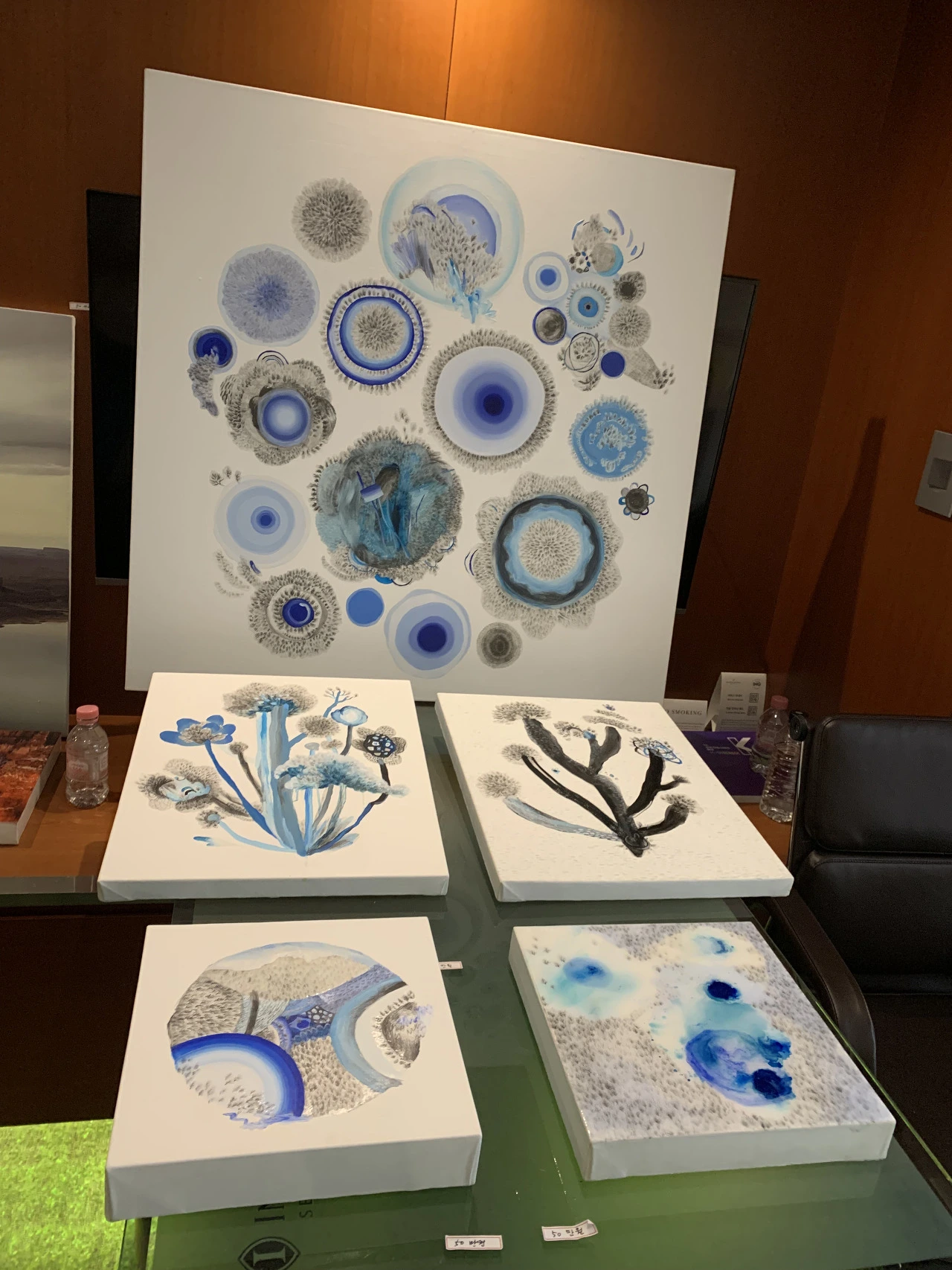 민지 작가님의 동물들 그림, 사진은 찍지 못했지만 한민수 작가님의 로봇과 인간의 관계를 희화한 그림, 목련꽃과 얇은 선으로 아름다움을 표현한 그림, 북극곰과 토끼 등의 동물들을 그린 현성 작가님의 작품, 도자기 위에 푸른 물감으로 그려놓은 작품 등등 가격을 떠나서 소장하고 싶은 정말 멋진 작품들이 꽤 많이 있었다. 나로서는 기본기가 되어있는 그림들이 솔직히 더 마음에 들었고 편안했다. 그게 아니라면 색채든 형태든 구성이든 어딘가 감각적인 느낌으로 사로잡는 그림이 좋았다.