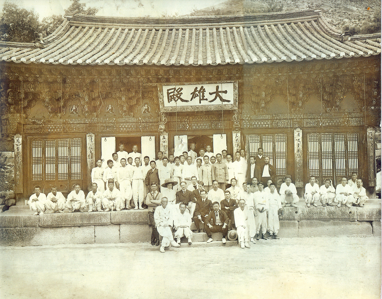 그런데 본래 진관사 대웅전에는 의창군의 글씨가 아닌 추사의 글씨가 걸려 있었습니다. 6·25 전쟁으로 대웅전이 불타면서 함께 사라져 버리기는 했지만 몇몇 일제강점기 때의 사진 자료 속에는 엄연히 추사의 현판 글씨가 걸려 있는 것을 볼 수 있습니다. 1910년 6월 기독교청년회의 제1회 하령회(여름수련회)가 진관사에서 열렸는데 당시에 찍은 기념사진에도 추사의 글씨는 또렷이 남아있습니다. 뿐만 아니라 서울 봉은사와 양평 용문사 대웅전 현판은 추사의 진관사 현판을 모각한 것이라 하니 비록 불타버리기는 했어도 추사의 진관사 대웅전 현판은 오늘날까지도 여전히 남아있는 셈이라고 할 수 있습니다.