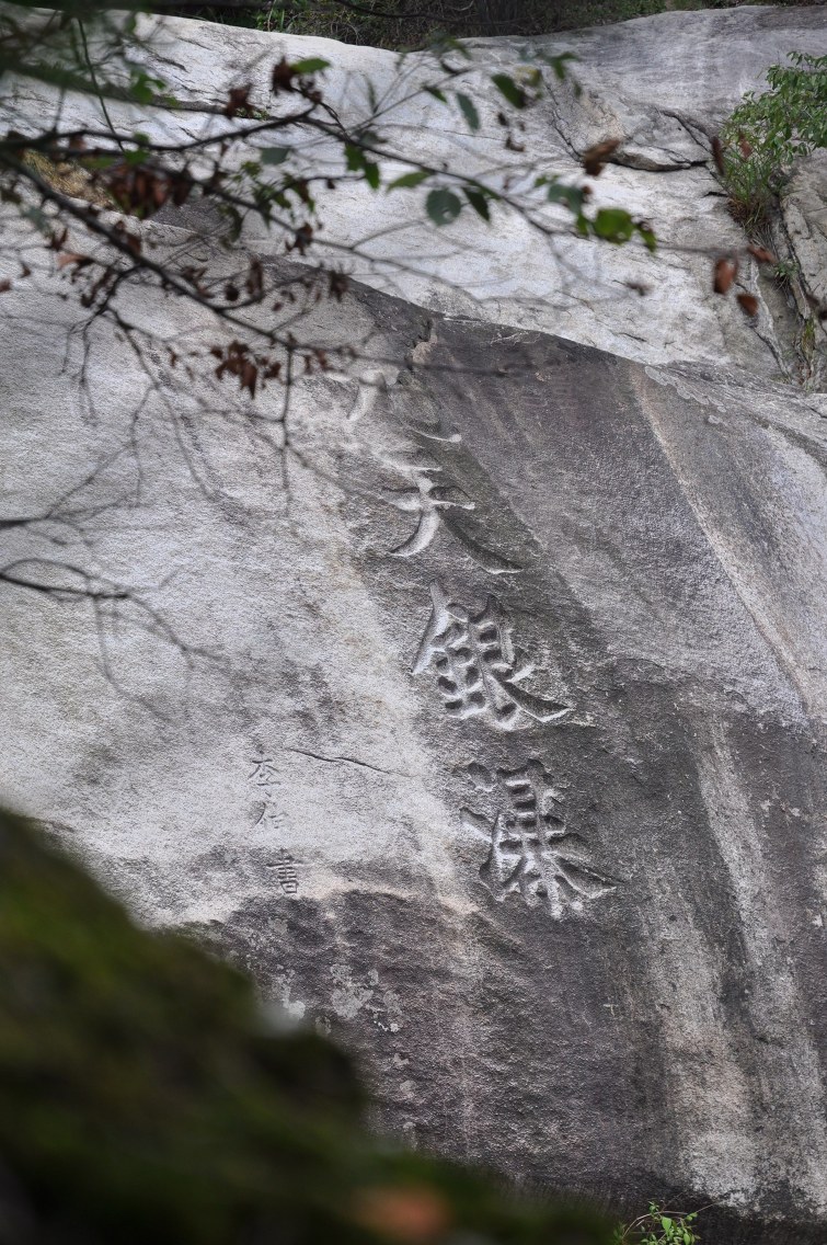 그 밖에도 폭포 상단 암벽에 구천 은폭이라는 글씨를 새기고, 또 폭포 주변에는 송계 별업(松溪別業), 창벽(蒼壁), 한담(寒潭) 등의 글씨를 새겼다고 하나 지금은 구천 은폭 네 글자만 완연한 옛 모습을 자랑하고 있을 뿐 나머지는 찾아볼 수 없다. 구천 은폭 바위글씨는 한 글자 당 가로세로 70㎝ 크기로 전체 3미터 규모이다. 해서체로 위에서 아래로 내려썼으며 오른쪽 하단에 이신(李伸)이라고 써서 글씨의 주인이 누구인지 밝히고 있다. 이신에 대해서는 아직 정확히 알려진 것은 없다. 다만 인평대군의 1659년 연행기(燕行記)인 연도 기행(燕途紀行)에, “당하관 전 현감 이신이 예방을 맡았다.”라고 한 기록이 있고, 또 유본예의 한경지략(漢京識略)에 “흥화문은 경희궁의 정문으로 이신이 썼다.”라는 기록이 있어 이신이 인평대군과 상당한 친분이 있었고 당대에 제법 이름 있는 명필이었음을 짐작해 보는 정도이다. 물론 두 책에 나오는 인물이 동일인이라는 전제하에서 말이다.