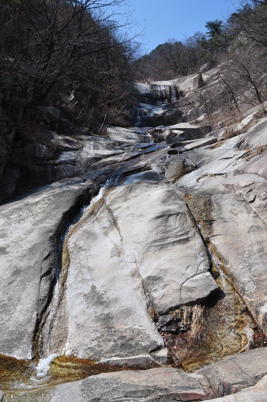 지금은 지역주민들을 위한 배드민턴장이 설치되어 있는 옛 인평대군 별서 터에 올라 계곡 건너편을 바라보니 아홉 굽이 층계를 이룬 폭포가 위풍당당 버티고 서있다. 북한산 자체가 거대한 화강암을 지반으로 한 돌산이기에 양쪽 봉우리가 봉황의 날개처럼 우뚝 솟은 사이로 매끈한 화강암 피부를 자랑하며 서있는 구천 은폭은 흡사 미켈란젤로의 조각상들을 대하는 것처럼 군더더기가 없다.