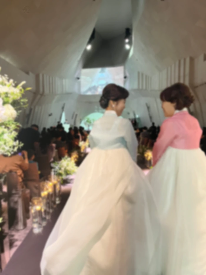 말간 하늘빛 한복에 혼주 화장까지 더하니 세상 고왔던 우리 엄마,