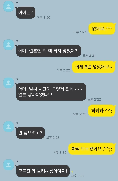 "아이는 없니?", "아이는 안 갖게?", "애 안 낳으려고?", "왜 안 낳아?".........
