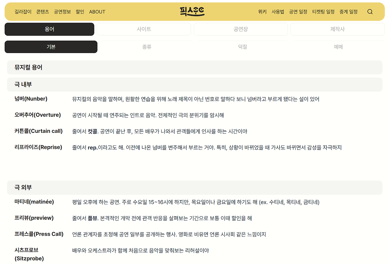 뮤지컬 관련 사이트를 만들려고 다짐한 것도 실용적인 정보를 체계적으로 정리하고 싶어서였습니다. 정보의 비대칭성으로 진입을 머뭇거리는 사람이 있다면 돕고 싶었거든요. (좋아하는 걸 같이 좋아하면 좋으니까요.) 공연을 보려면 기본적으로 "티켓을 예매한다 → 공연장에 도착한다 → 공연을 관람하다"의 단계로 이루어집니다. 뮤지컬이 처음인 사람들이 해당 단계에서 알면 좋을 정보들을 정리했어요.