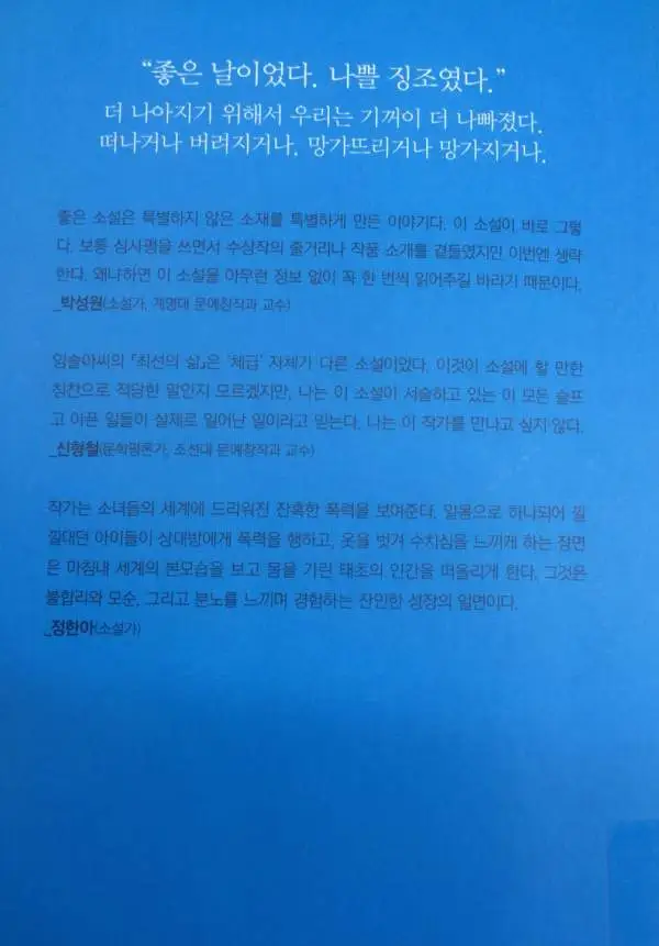 소설의 제목처럼 아람도 강이도 ‘최선의 삶’을 선택하고 열심히 살았다. 그렇게 살았던 열일곱 열여덟 열아홉 스물의 삶은 어떻게 흘렀을까. 최선의 삶이라는데 고개가 끄덕여진다. 그리고 그렇게 끄덕여지는 현실이 무섭다. 어른의 도움과 지지와 배움 속에서 자라야 할 청소년기라는 말이 무색하다. 강이와 아람과 소영이의 옆에 어른들은 누구일까 잠시 생각해본다. <벌새>도 생각나고 내 옆의 누군가도 생각나고 나도 돌아보게 된다. 작가는 10대 시절부터 이야기들을 무의식적으로 적기 시작했고, 성인이 되어서까지 끊임없이 같은 꿈으로 찾아왔던 악몽을 정리하고 싶었다고 했다. 작가에게 꼬리에 꼬리를 물고 놓지 않았던 악몽은 무엇이었을까. 악몽은 작가에게 무엇을 말하고 싶었을까. 작가는 왜 악몽을 놓지 못했을까. 대학문학상인 이 소설은 생각지도 않은 수상이라는 결말로 이 악몽과 인사하게 되었다고 ‘행복하다’는 작가의 소감이 덧붙여져 있다. 다행스럽다. 작가 스스로의 힘이다. 스스로 악몽과 이별하였다. 작가야말로 어른이 되었을 것이다.