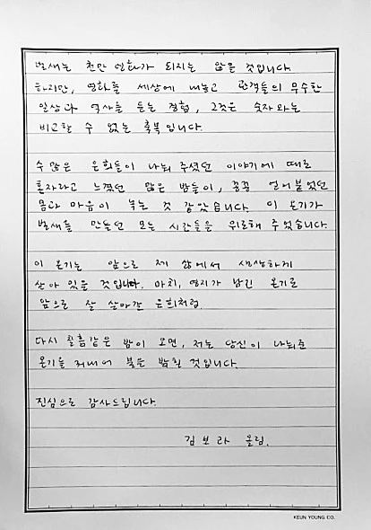언제 쓰여졌을지 모를 ‘김보라 감독’의 편지를 읽었다. <벌새>를 보고 여러 소감들과 이야기를 나누는 것이 참 좋았다. 그리고, 그것과 함께 김보라 감독의 영화 이야기를 듣는 것도 큰 행복이었다. 오늘 다시 이 편지를 접하며 따스한 온기를 느낀다.