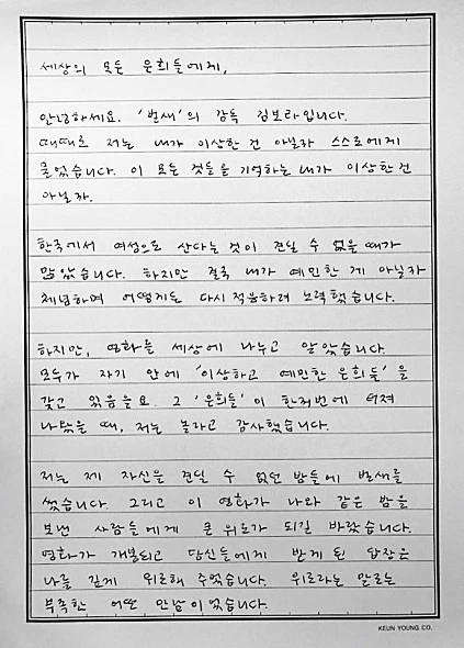 저는 제 자신을 견딜 수 없던 밤들에 벌새를 썼습니다. 그리고 이 영화가 나와 같은 밤을 보낸 사람들에게 큰 위로가 되길 바랐습니다. 영화가 개봉되고 당신들에게 받게 된 답장은 나를 길게 위로해 주었습니다. 위로라는 말로는 부족한 어떤 만남이었습니다.