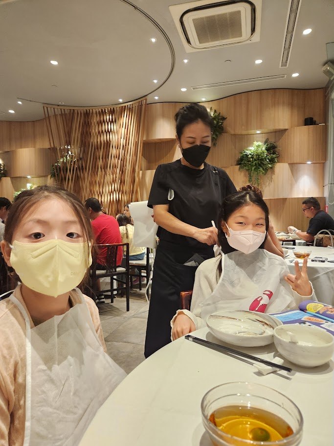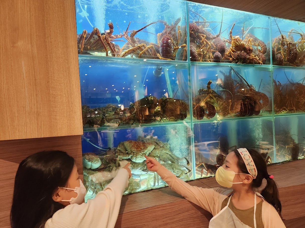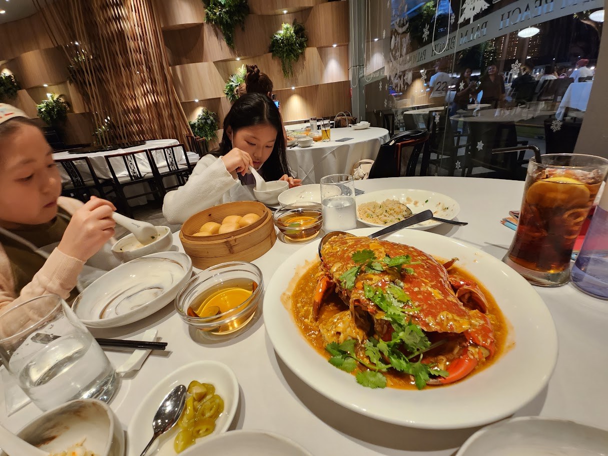 자리에 앉으면 종업원이 직접 앞치마를 매어주고 매실이 담긴 물을 내어오는데 절대 마셔서는 안 된다. 크랩 먹고 손 닦을 물이다. 주문을 하기 전 아이들이 직접 먹을 크랩을 골랐다. 크기도 제일 큰걸 골랐다. 예약을 했음에도 크리스마스 당일이라 조금 늦게 입장을 해서 너무 배가 고팠던 지라 칠리 크랩과 볶음밥을 주문했는데 크랩에 같이 먹을 빵(bun)이 서비스로 나오니 양을 보며 시켜도 된다.