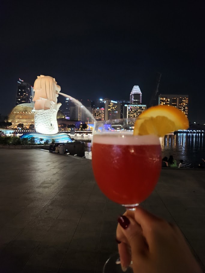 배도 부르고 야경도 봤는데 이대로 숙소에 들어가긴 뭔가 아쉽다. 싱가포르의 유명한 칵테일인 '싱가포르슬링'을 술집도 아닌 멀라이언 상 바로 앞 노천카페에서 주문했다. 여긴 노천계의 백화점 같았다. 어린이부터 실버세대까지 다 잡고 싶었는지 아이스크림부터 커피, 칵테일까지 다 판다. 싱가포르는 정해진 장소 이외에 술을 마시면 벌금이라 멀라이언상 앞 계단에 앉아 있는 사람들은 음주를 할 수 없다. 모두 건전하게 대화만 하므로 거리도 깨끗하다. 이런 법은 한국에 도입이 필요해 보인다. 나도 사진만 찍고 오겠다고 주인에게 허락받고 자리로 돌아와서 마셨다.