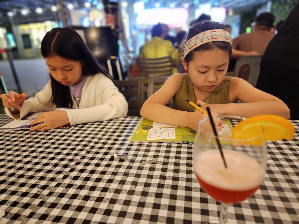 엄마가 칵테일 한 잔 하는 동안 아이들은 무엇을 할까? 여행을 준비하며 1에서 9까지의 숫자가 가로세로칸에 모두 들어가야 하는 스도쿠책을 두권 샀는데 아이들은 여행 중 줄을 기다려야 할 때, 식사를 기다릴 때 등 짬짬이 스토쿠를 하다가 한 권을 꽉 채우고 스토쿠의 달인이 되었다.