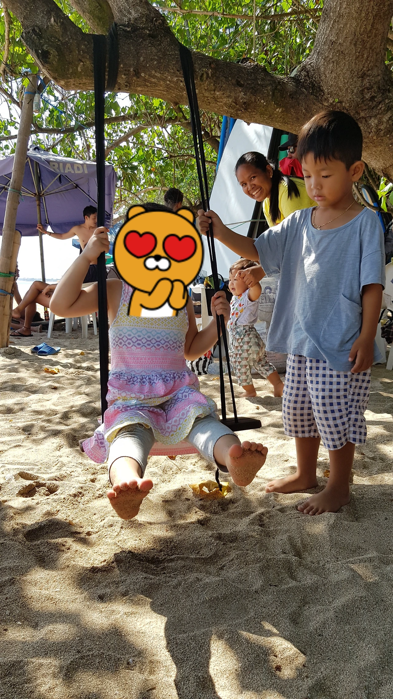 언니가 서핑을 배우는 사이 둘째는 서핑 강사의 아들이 밀어주는 그네를 조심스럽게 타보고 있다. 두 아이의 어색한 표정을 보니 웃음이 절로 나왔다. 남동생을 돌봐주는 발리 내니도 웃음을 참지 못하며 계속 둘의 놀이를 지켜본다.