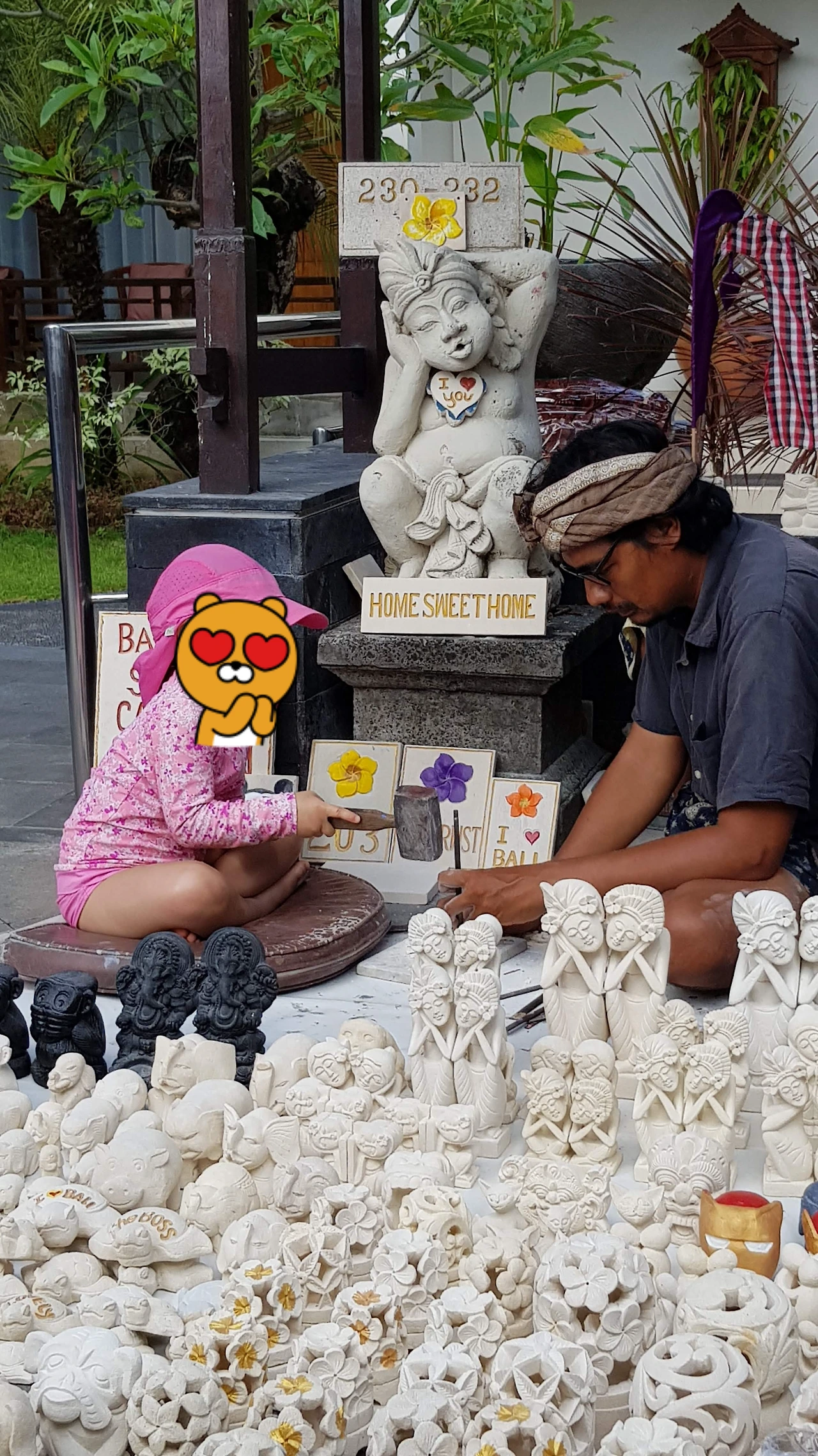 아이에게 먼저 하고 싶은 조각을 고르라고 한다. 주로 작은 꽃과 I LOVE BALI 글씨가 새겨진 하트 조각, 거북이 등이 있는데 우리 아이들은 큰아이는 거북이, 둘째는 꽃을 선택했다. 돌조각이라고 하면 아이들이 할 수 있을까? 생각이 들지만 조각가가 도구로 자리를 잡아주고 아이는 망치로 통통 두들기다 보면 어느새 완성이 된다.