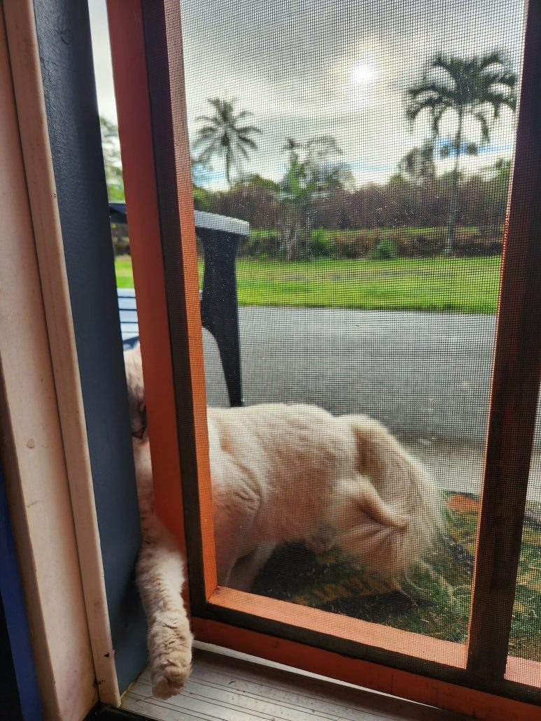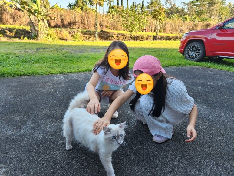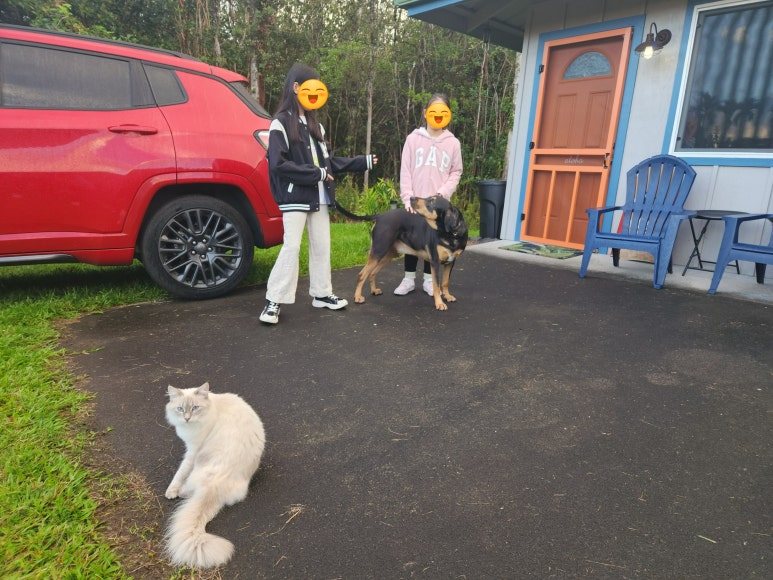 코나에서 힐로까지 장장 두 시간의 운전 피로가 스르르 풀리는 마법 같은 순간이다. 우리의 도착 소리에 넓은 마당에 펜스 하나를 두고 사는 호스트가 나와 환영인사를 하고 키우는 애완동물 중 강아지 잭과 부기 두 마리와 개냥이 'kea'를 소개하며 이 세 마리는 거의 풀어놓고 기르다시피 하니 혹시 불편하면 말해달라 이야기한다.