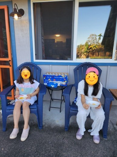 짐 옮겨놓고 아이들은 시리얼과 망고를 먹으며 잠시 쉬는 중. 빅 아일랜드 도착 첫날 코스트코에서 11불 주고 산 30개 들이 물 1박스. 절반이 남아 차에 싣고 왔다. 빅 아일랜드 머무는 6일 내내 셋이서 마시기 충분했다. 앞에 200여 평의 넓은 잔디가 펼쳐진 저녁노을이 바로 보이는 아름다운 우리의 에어비앤비 힐로 숙소.